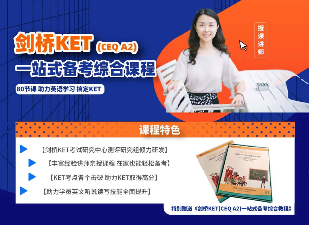 给大家隆重推出两门线上课程,助力大家高分通过剑桥CEQ A2 KET/B1 PET考试。