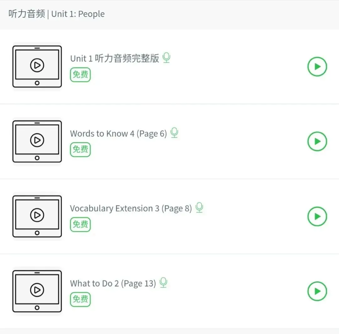 每个单元还配有便于学生查找的配套听力音频文件,便于学生进行日常听力练习。