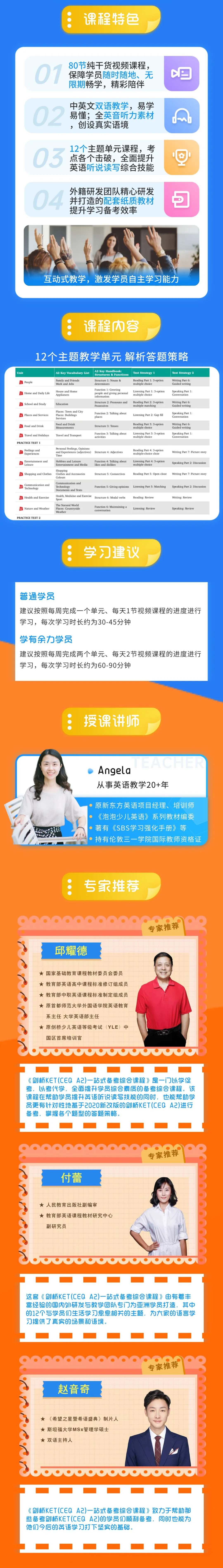 每个单元包含满满5-6节、每节约30分钟,由Angela老师亲授的视频课程。课程内容完全匹配《CONQUER CEQ A2:剑桥CEQ A2一站式备考综合教程》由浅入深细致的讲解,让孩子自主学习和备考变得更加轻松和高效。