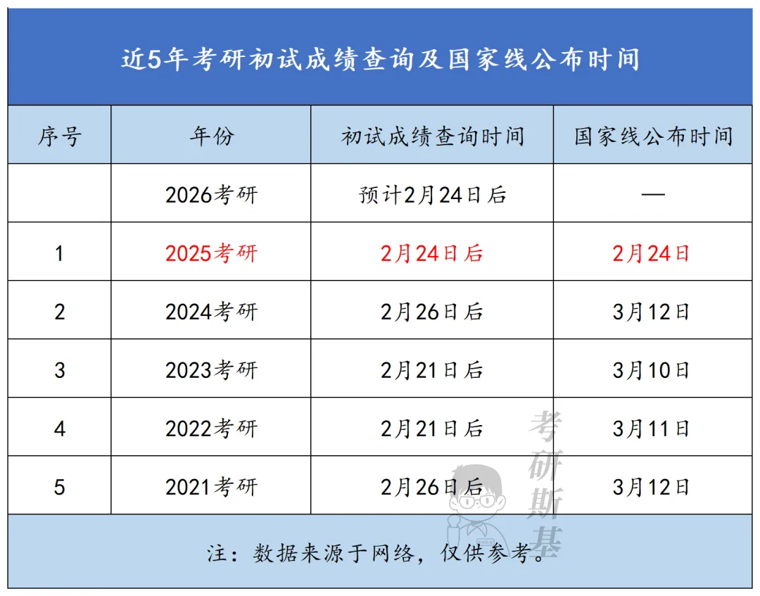 回顾近5年的时间点,可以发现初试成绩公布基本都是在2月下旬,春节后、元宵节后。往年国家线的公布时间大都在3月中旬,去年政策调整,考研出分和国家线甚至在同一天发布。