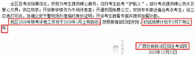 从广西招生考试院25年12月21日发布的通知中得知,该地区研考评卷工作将于2026年1月上旬启动,初试成绩计划于2月下旬公布。
