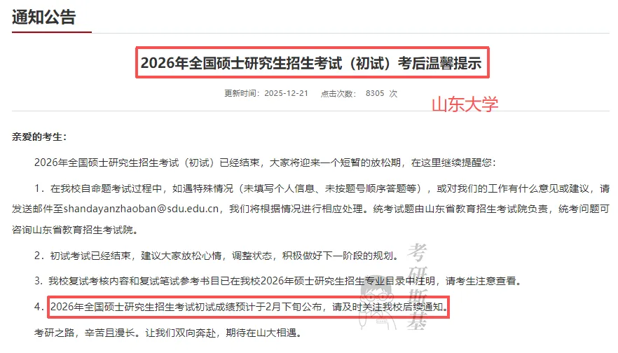 根据山东大学研究生院25年12月21日发布的通知,该校2026年全国硕士研究生招生考试初试成绩预计于2月下旬公布。