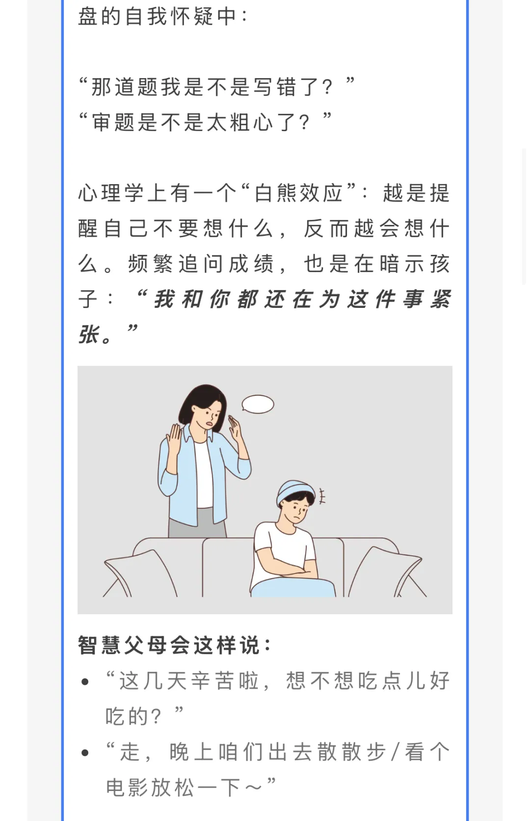 期末考试终于结束了,孩子们长舒一口气,放下笔,也暂时放下了紧绷的神经。不少家长却依然“悬着一颗心”,总想从孩子那里探知考试的结果,甚至不自觉地说出一些“关心的话”——殊不知,有些话不仅无法帮孩子放松,还可能影响到他们的情绪与自信。