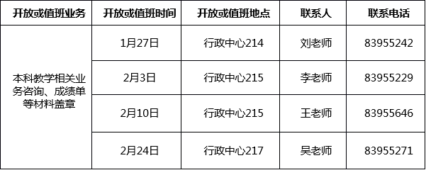 1.为方便学校师生在寒假期间办理本科教学相关事项,教务处将安排人员值班。