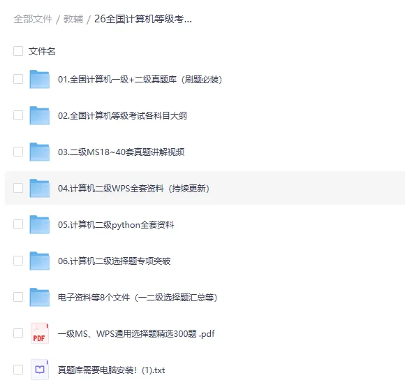 26年3月计算机二级考试资料包,考试大纲+题库+讲解视频+专项突破+专用软件。资料目录如下,完整版资料下载方式见文末。