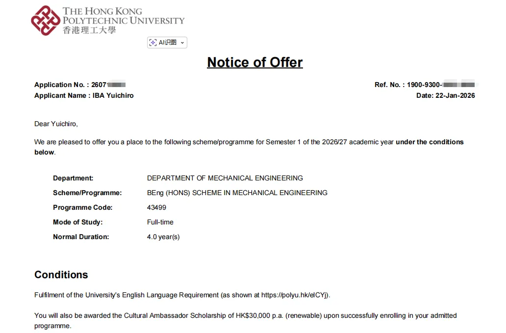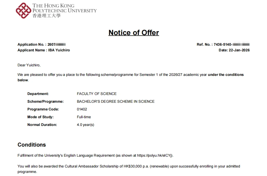 双份奖学金含金量拉满!港理工奖学金评选严苛,综合考量学业、科研、素养等多维度能力,属高竞争性入学奖励。射场雄一郎同学能同时获两专业奖学金认证,既彰显其理科与工程思维的均衡优势,更印证了港理工对其未来发展潜力的高度信任,这份荣誉实属难得。