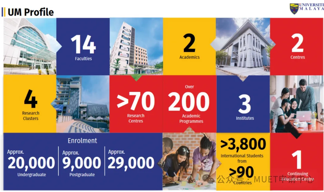 马来西亚大学内教学楼、教室设备齐全,室内均安装有空调,校内电脑室、梯阶教室、图书馆、实验室、资源中心、展览大厅、咖啡吧、休息室、会议室、操场一应俱全,并设有学生福利委员会、国际学生事物部处理各种问题。