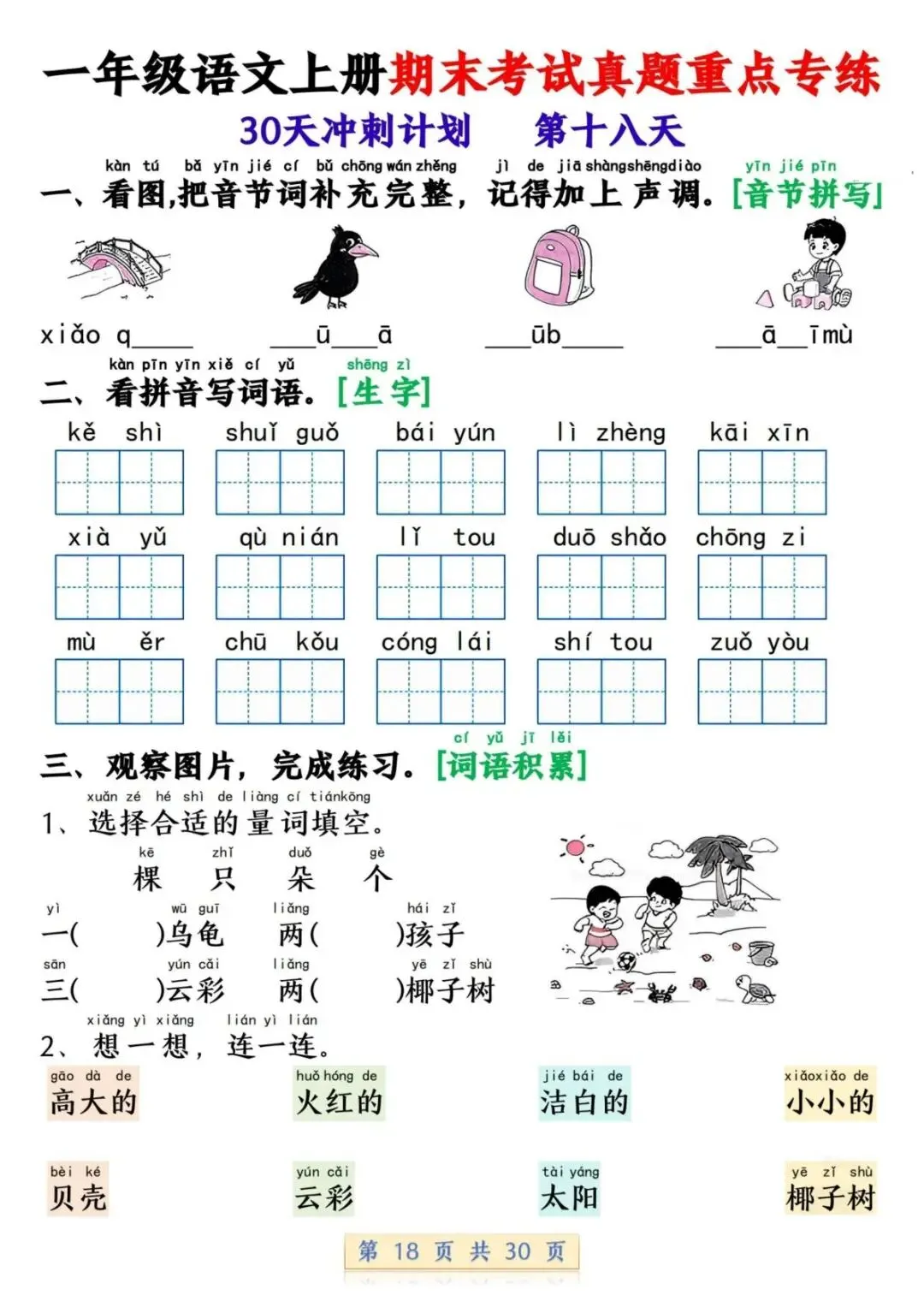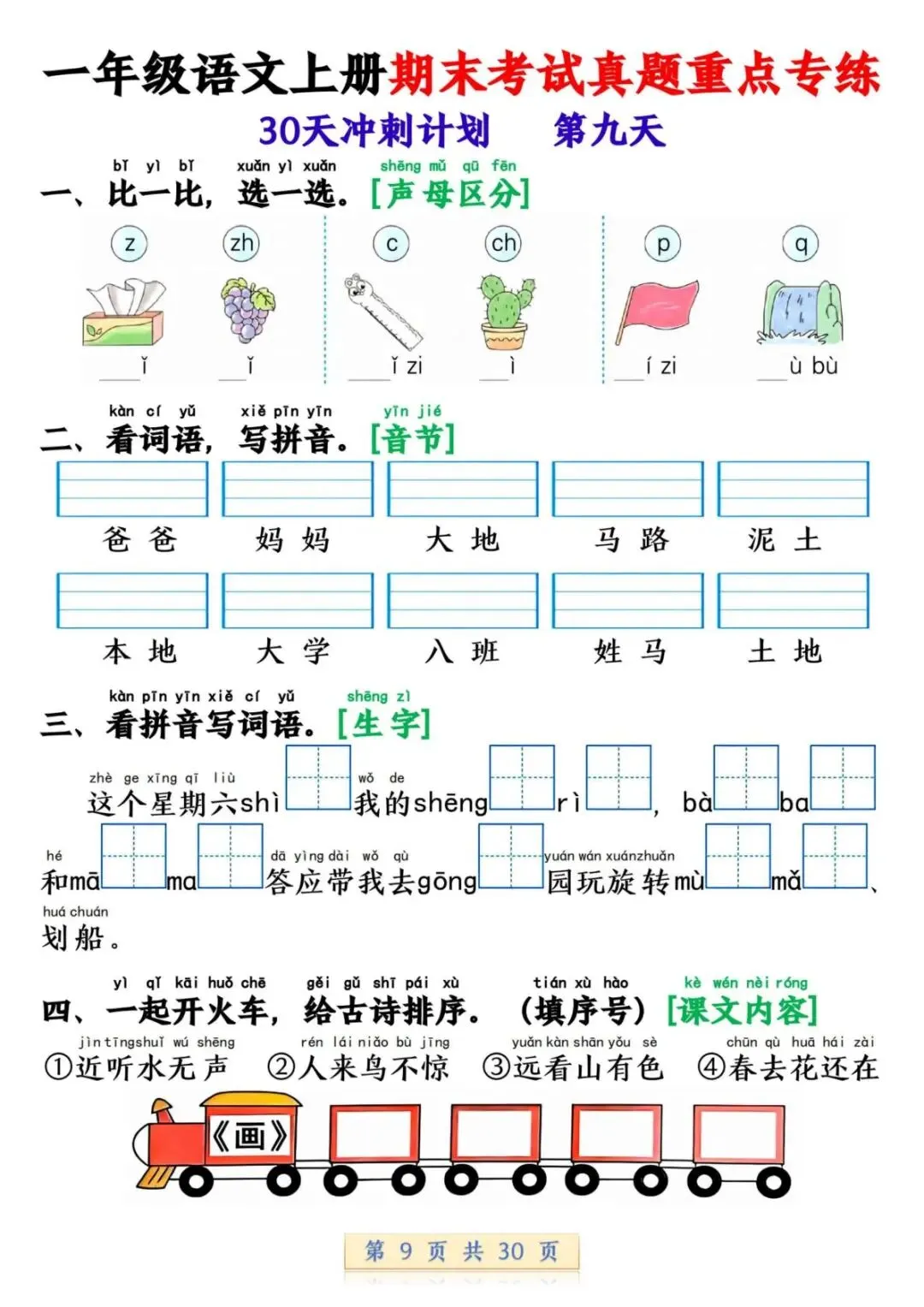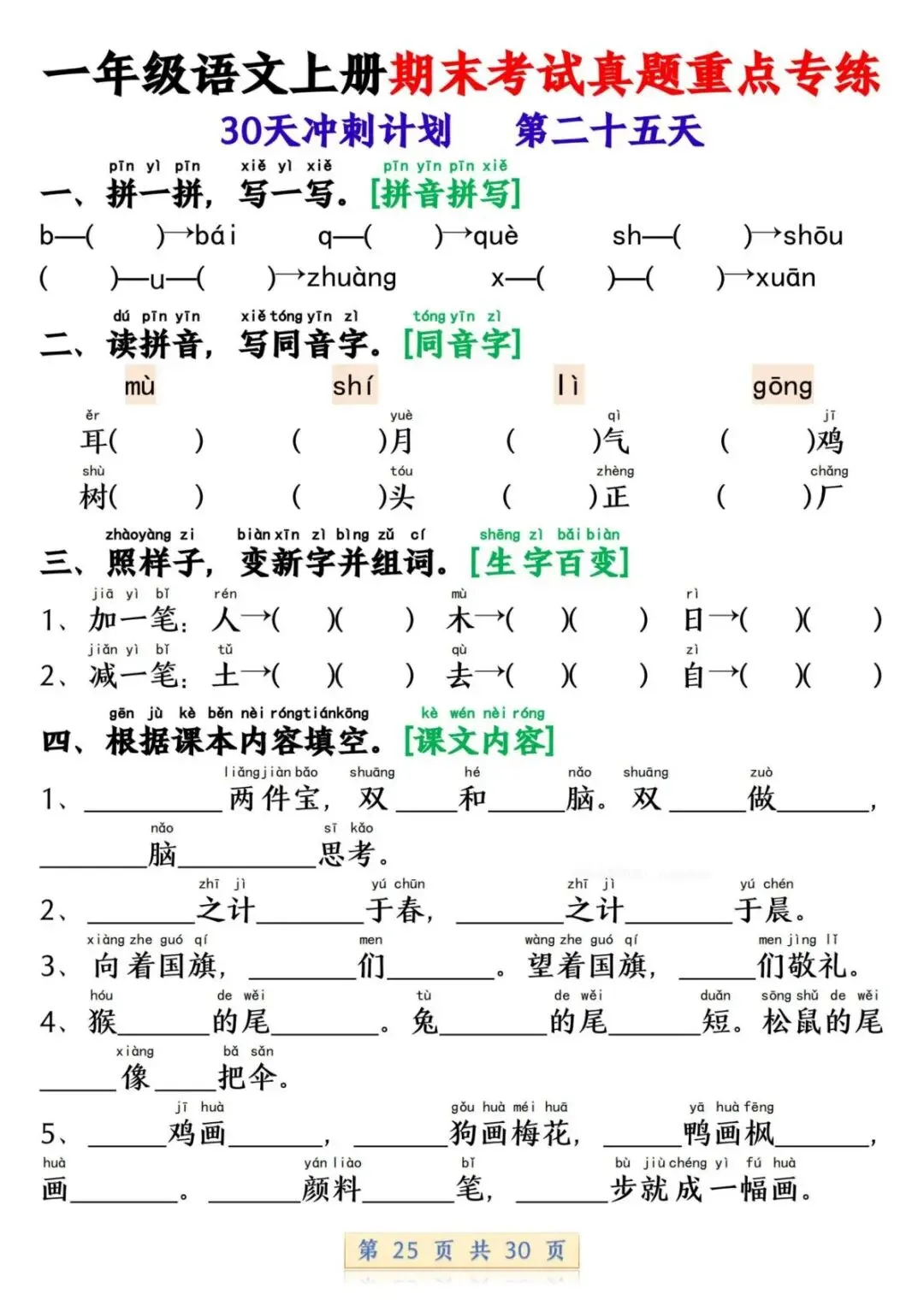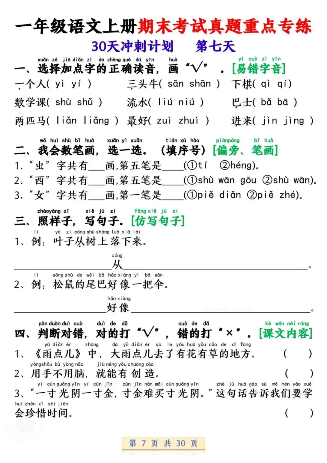 一年级语文上册期末考试真题重点专练 30 页新鲜出炉!涵盖课本所有重点内容,题型贴合期末考真题,从基础到提升,梯度合理。孩子练完能摸清考试套路,减少失分点。打印方便,省心省力,是期末复习的绝佳帮手!