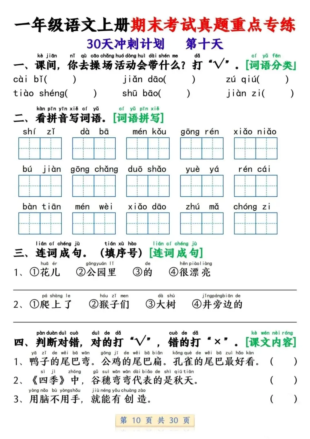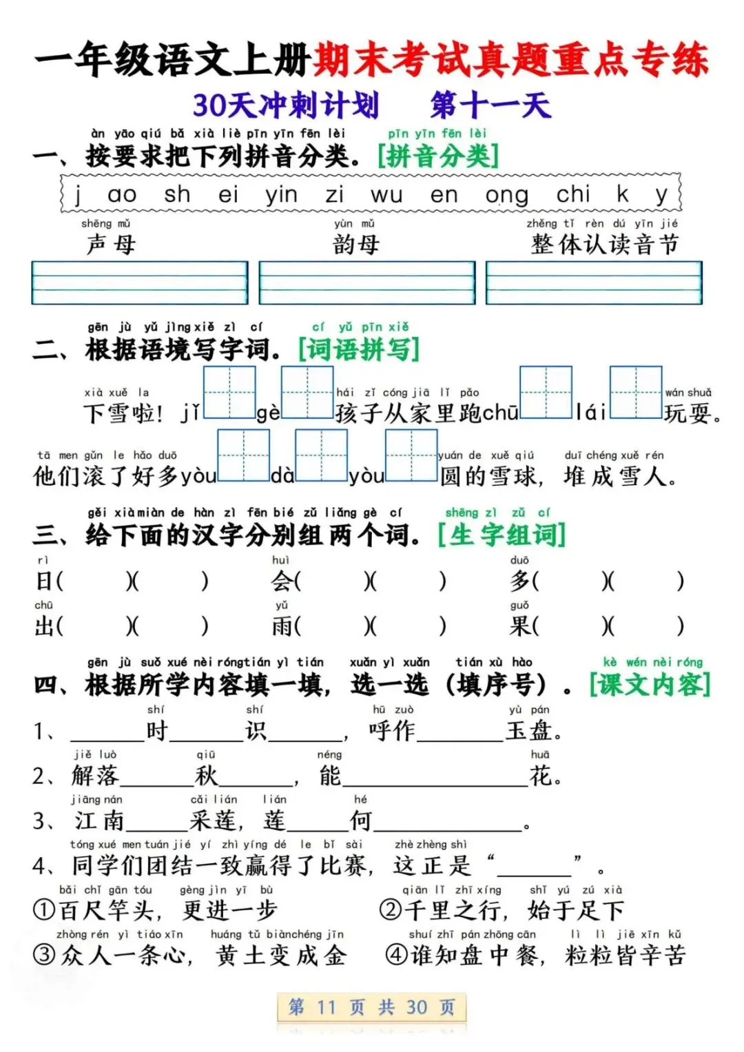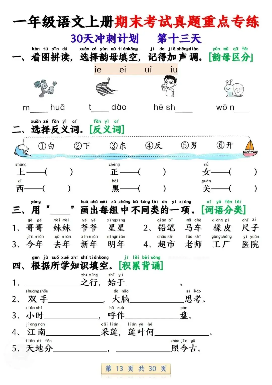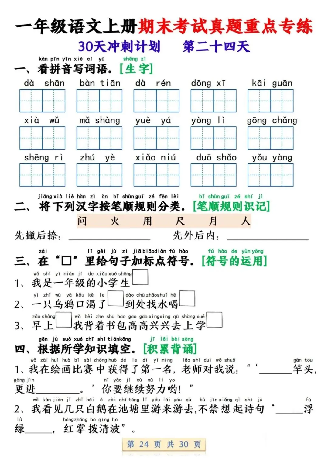 一年级语文上册期末考试真题重点专练 30 页新鲜出炉!涵盖课本所有重点内容,题型贴合期末考真题,从基础到提升,梯度合理。孩子练完能摸清考试套路,减少失分点。打印方便,省心省力,是期末复习的绝佳帮手!
