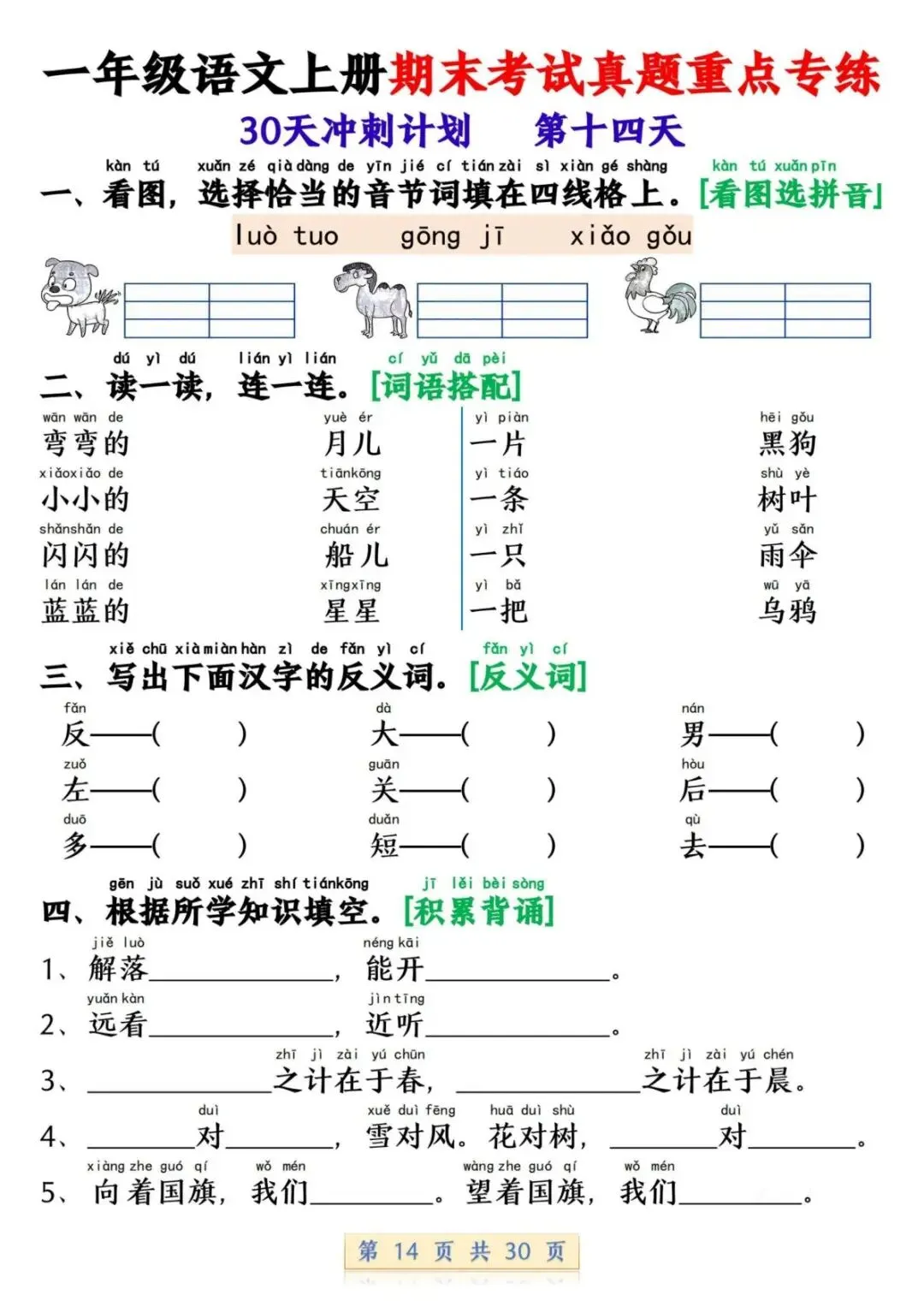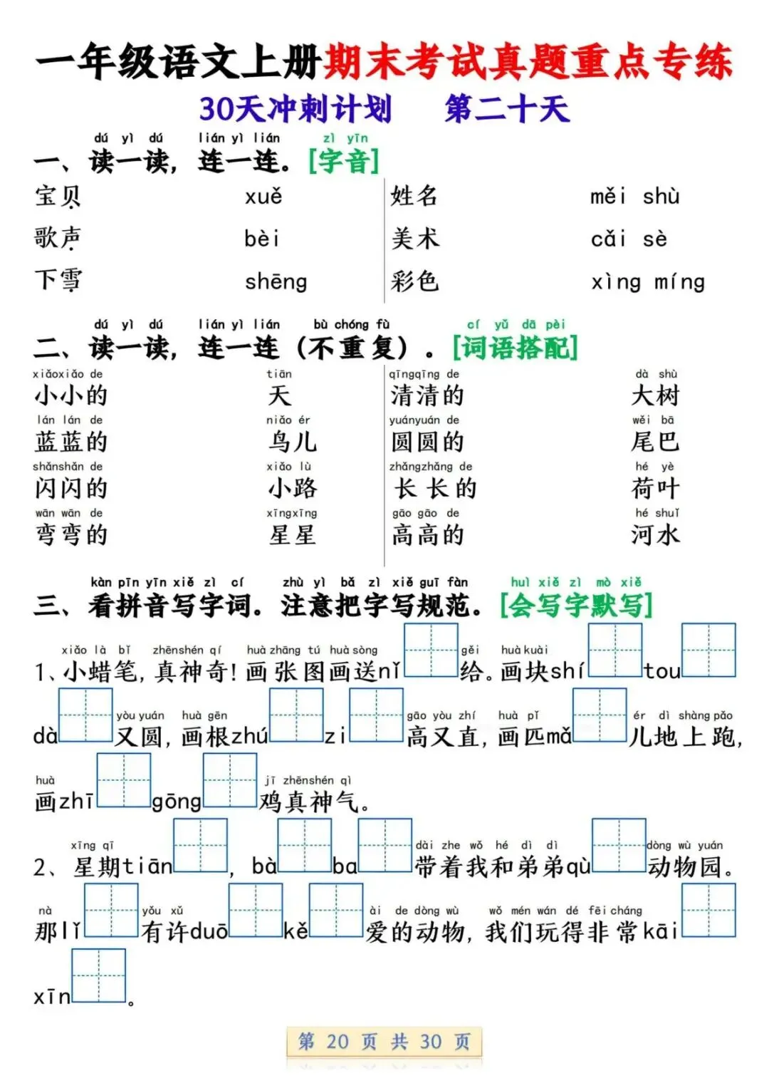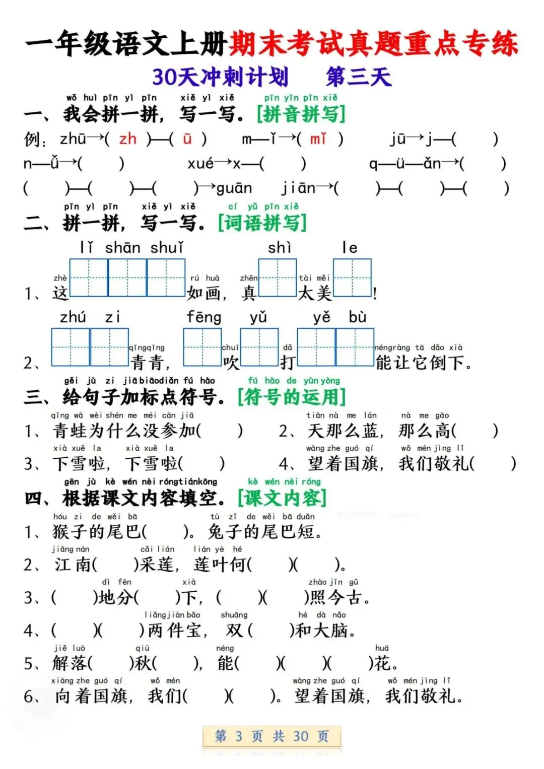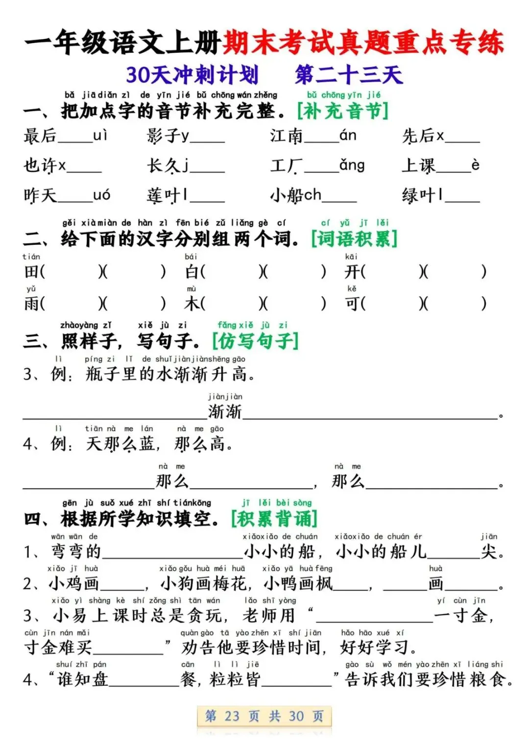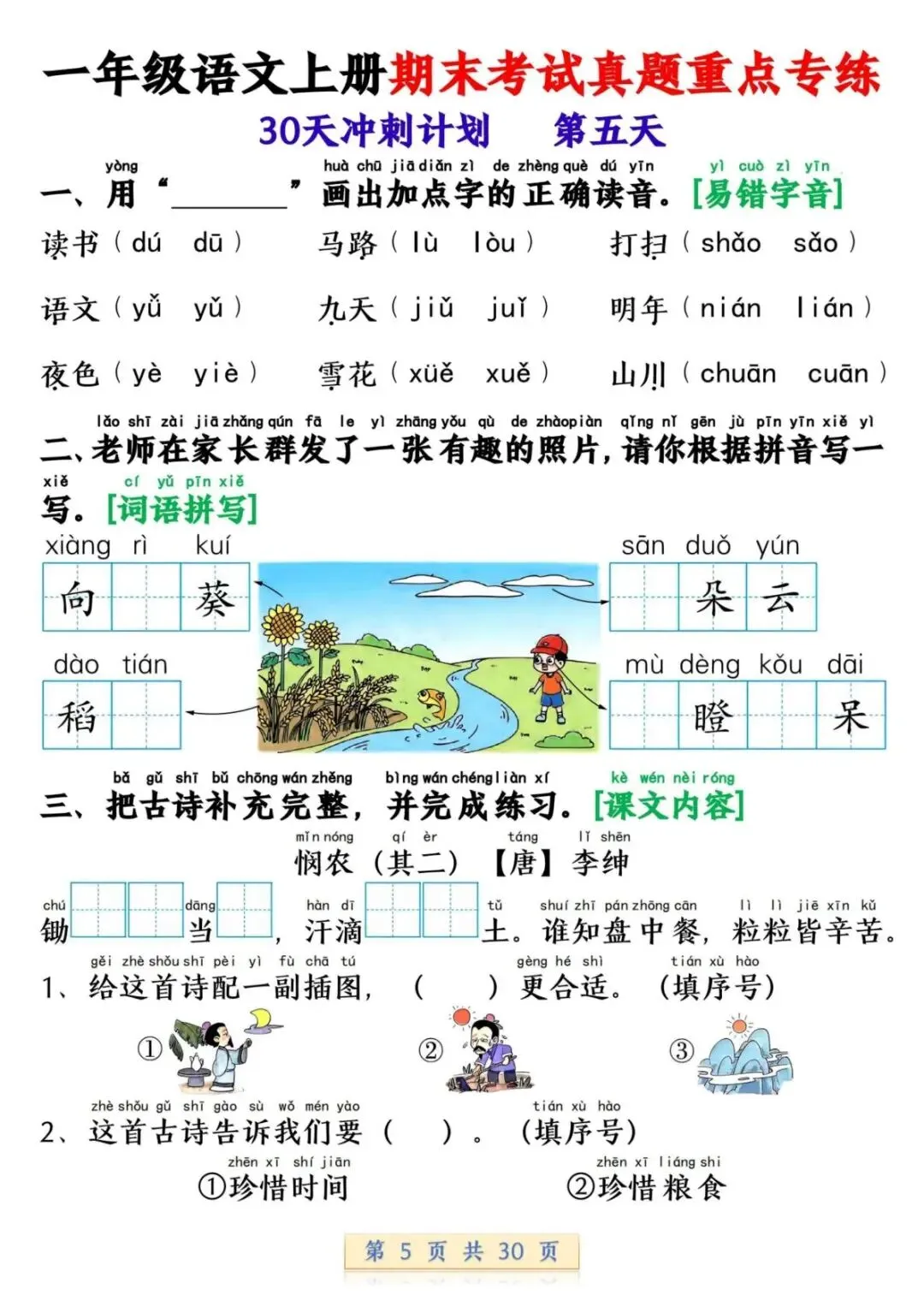一年级语文上册期末考试真题重点专练 30 页新鲜出炉!涵盖课本所有重点内容,题型贴合期末考真题,从基础到提升,梯度合理。孩子练完能摸清考试套路,减少失分点。打印方便,省心省力,是期末复习的绝佳帮手!