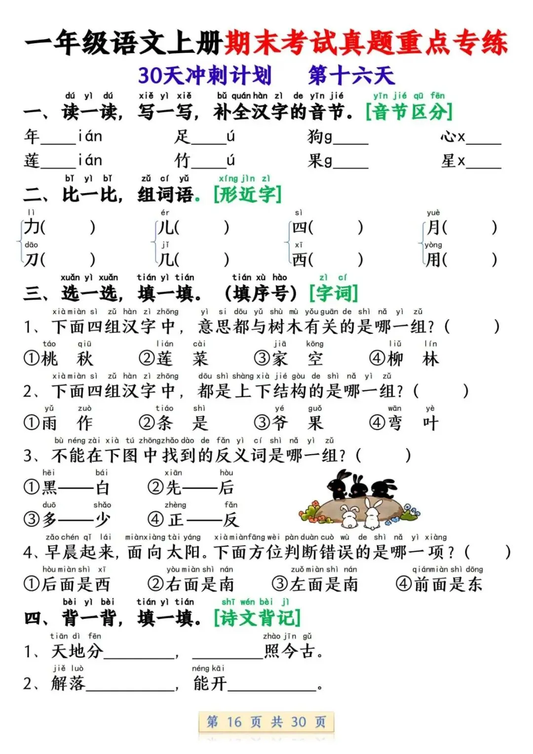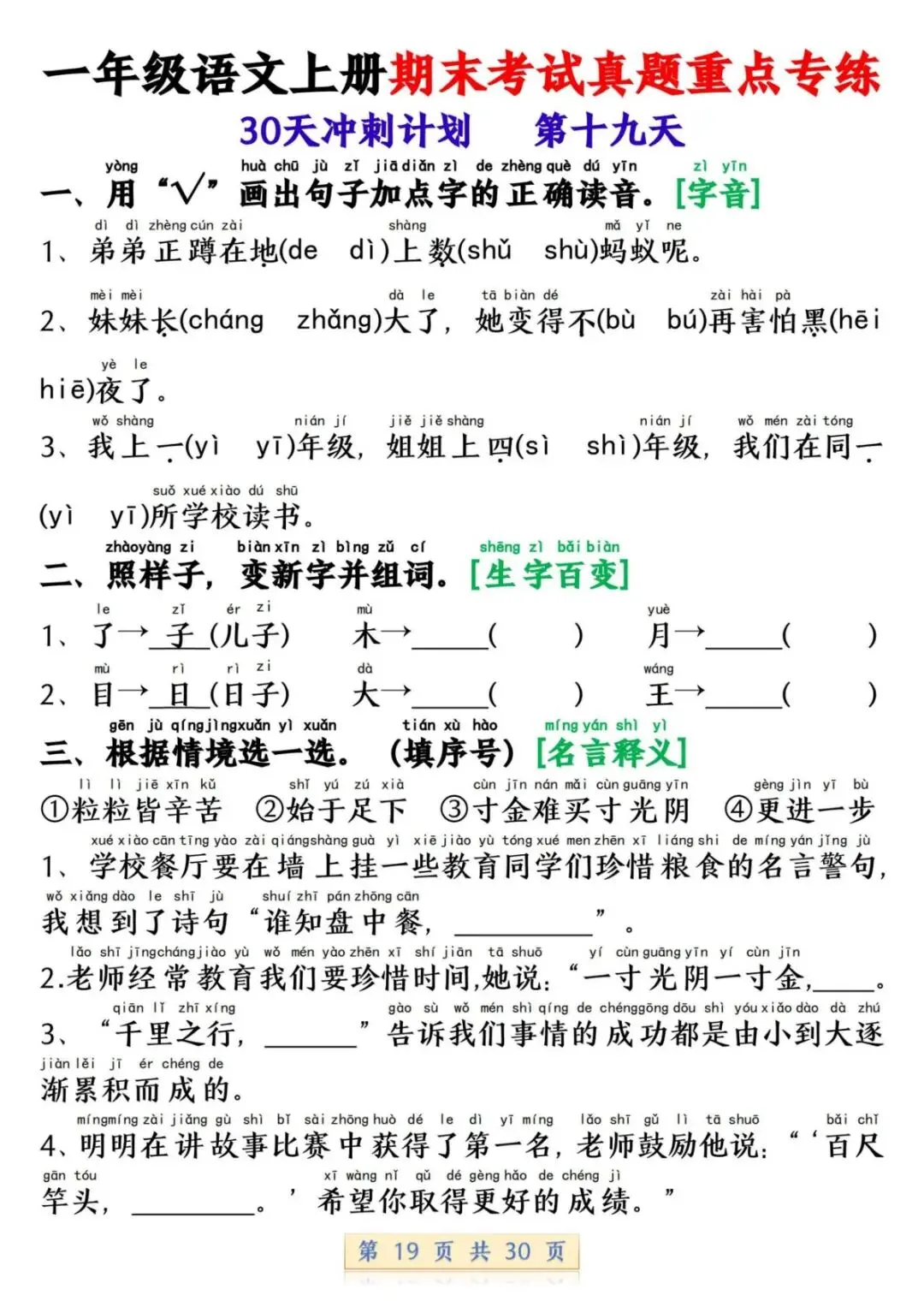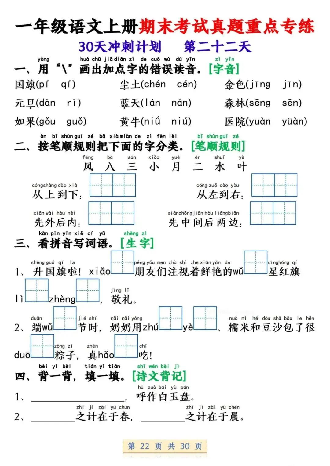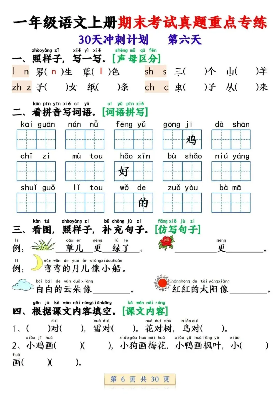 一年级语文上册期末考试真题重点专练 30 页新鲜出炉!涵盖课本所有重点内容,题型贴合期末考真题,从基础到提升,梯度合理。孩子练完能摸清考试套路,减少失分点。打印方便,省心省力,是期末复习的绝佳帮手!
