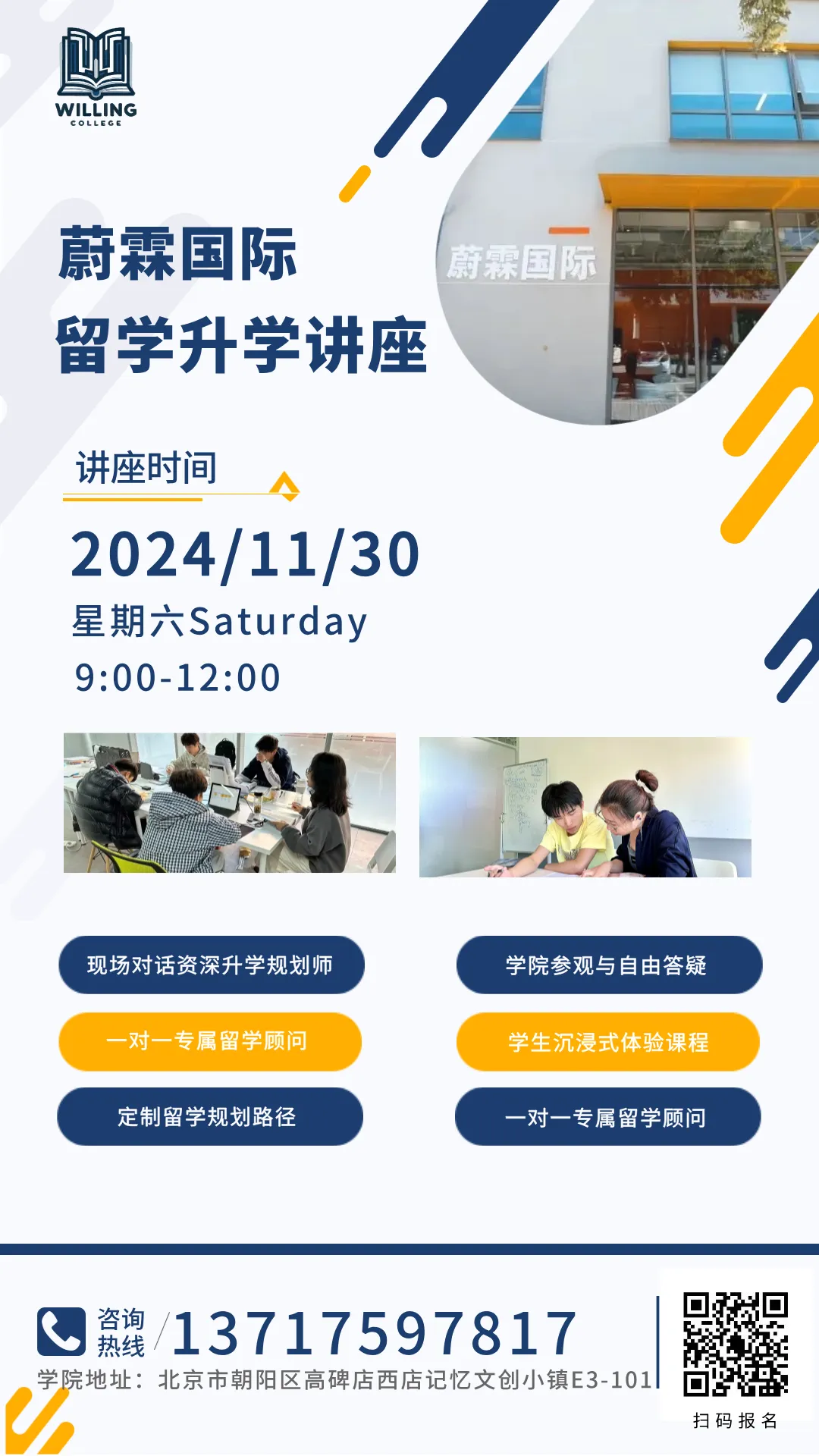 面对家长和学生们关心的各种问题,蔚霖国际留学将于11月30日举行线下升学讲座活动。