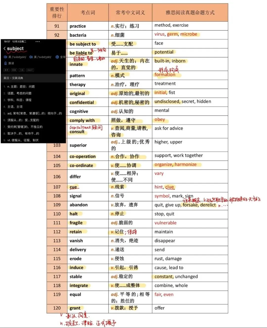 🙇🏻♀️背记:考⽣生请按下表中重要性排⾏顺序记忆100个考点词; 同时记忆真题命题⽅方式中相对应的72个同义替换 考点词(加粗单词)。 不熟的单词请定查出标注, 同时建议思考相关反义词表达。