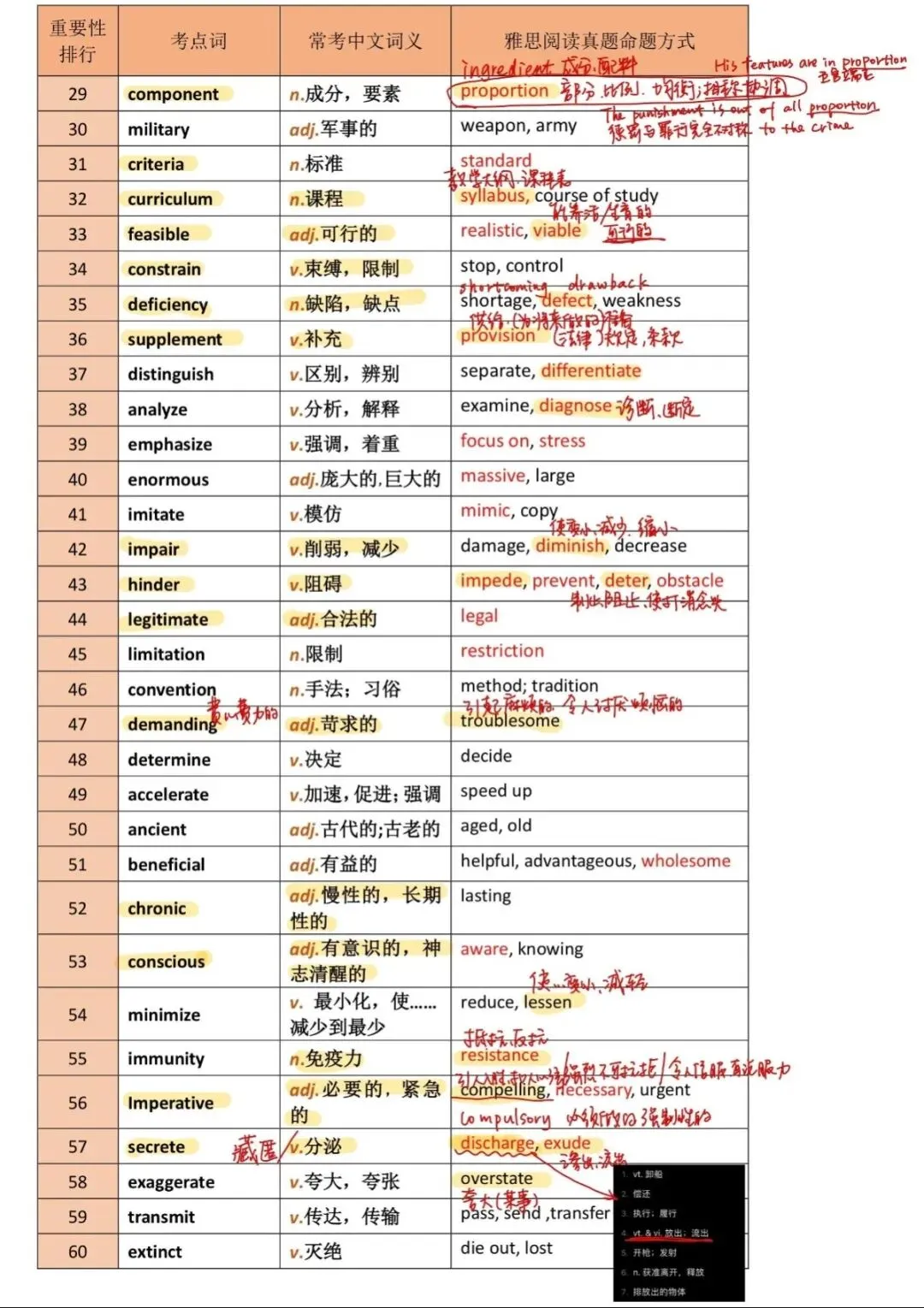 🙇🏻♀️背记: 考⽣生请严格按表中重要性排⾏顺序记忆20个考点词。 请同时记忆下表真题命题⽅方式中相对应的34个同义替换考点词加粗单词。不熟的单词请一定查出标注, 同时建 议思考相关反义词表达。