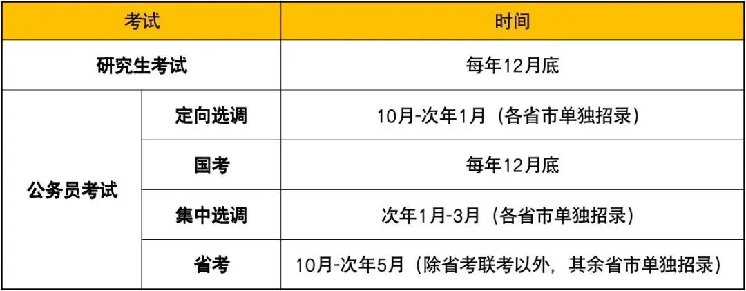 研究生初试在每年12月底进行,一年一次上岸机会;公务员考试分为国考、省考、定向选调、集中选调四类考试,即使你只接受在某个地区上岸公务员,一年至少也有3次机会(国考、下半年省考、上半年省考联考)。