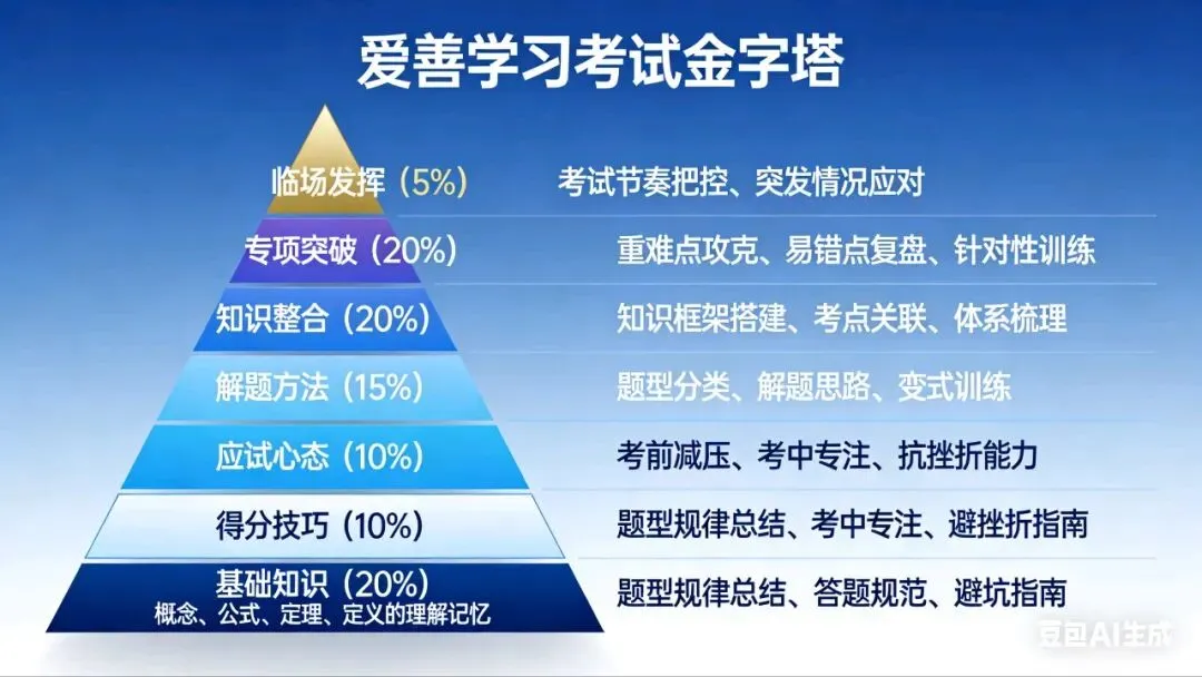 第7层(塔尖) 临场发挥 考试节奏把控、突发情况应对 5% 临门一脚,决定最终分数上限