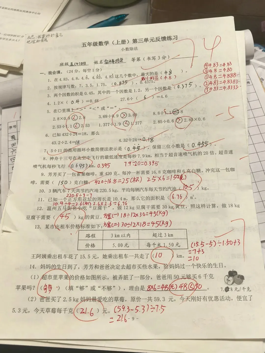 4. 计算题:考试平均分以上计算是基础。要慢,要争取💯。书写要规整,竖式计算要用尺子划线,步骤写完整(按步骤给分),计算时“分步算、回头查”,避免跳步出错,结果注意单位统一和化简(如分数化成最简)。