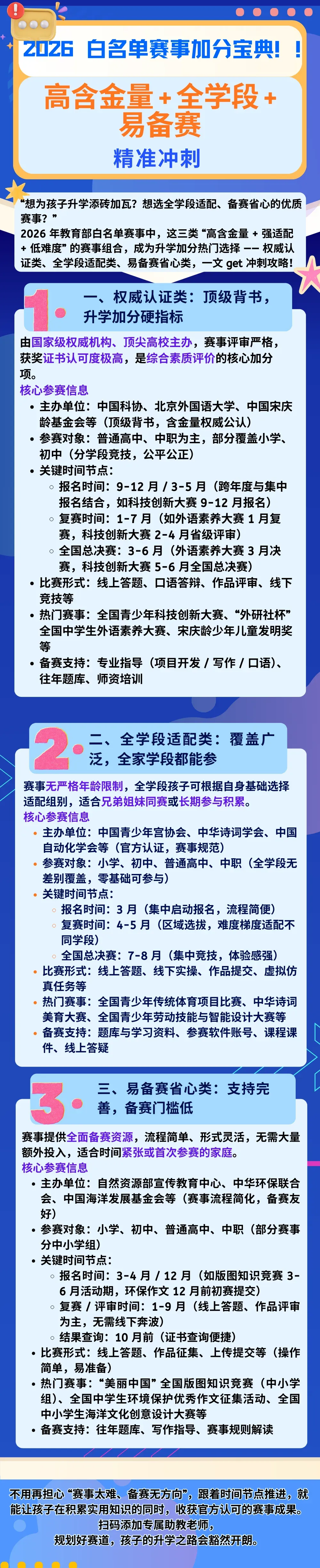 2026 年教育部白名单赛事中,这三类 “高含金量 + 强适配 + 低难度” 的赛事组合,成为升学加分热门选择 —— 权威认证类、全学段适配类、易备赛省心类,一文 get 冲刺攻略!