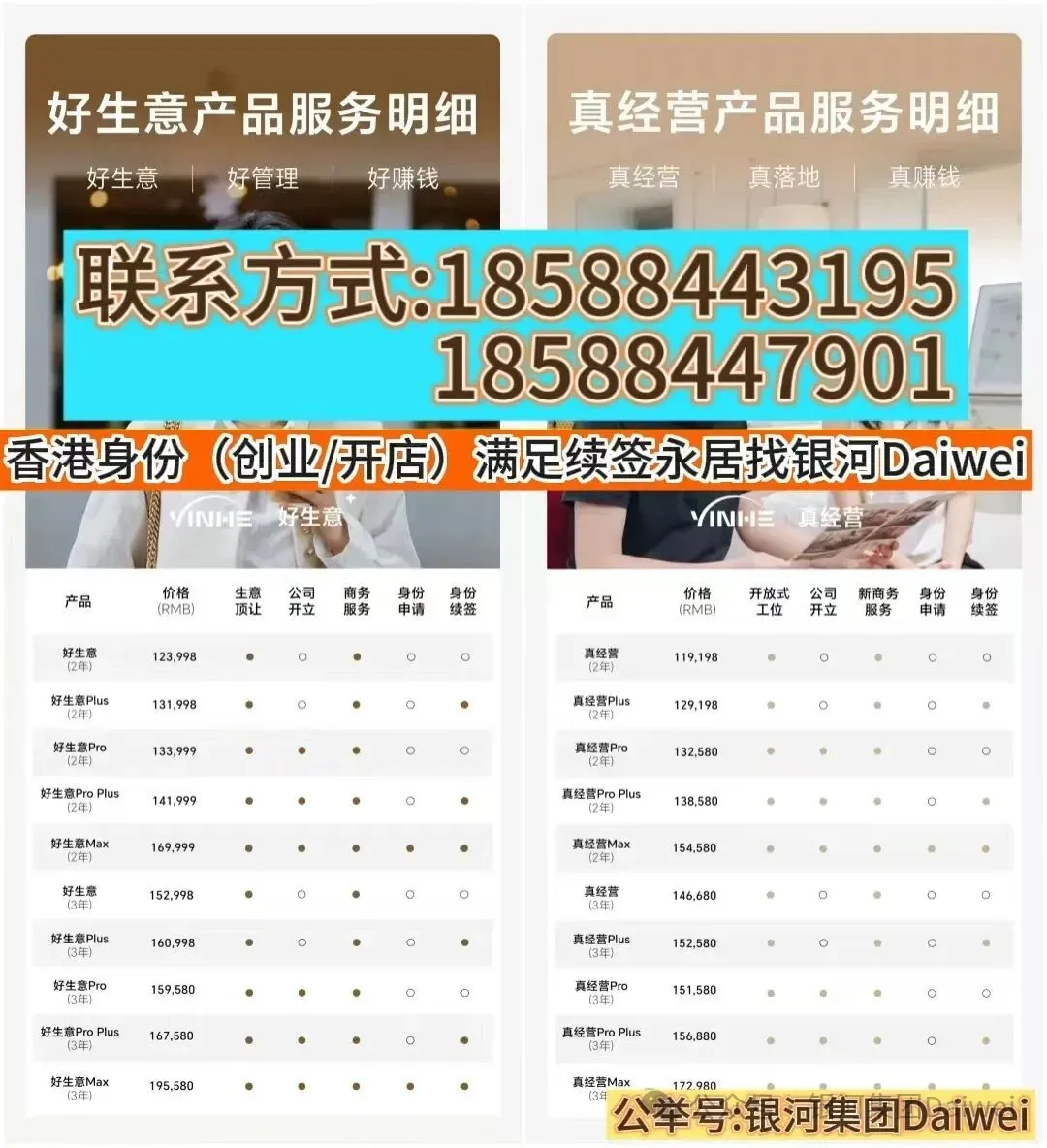 银河好生意和真经营——针对赴港创业服务如果你想要去香港开公司发展事业,不知道如何招聘人,搭建团队,不知道如何租赁办公室,银河集团为您提供全方位的“好生意和真经营”服务。找银河Daiwei:18588443195;18588447901;生活与资产配置:化解家庭后顾之忧