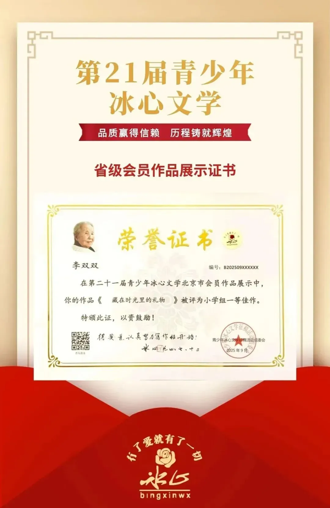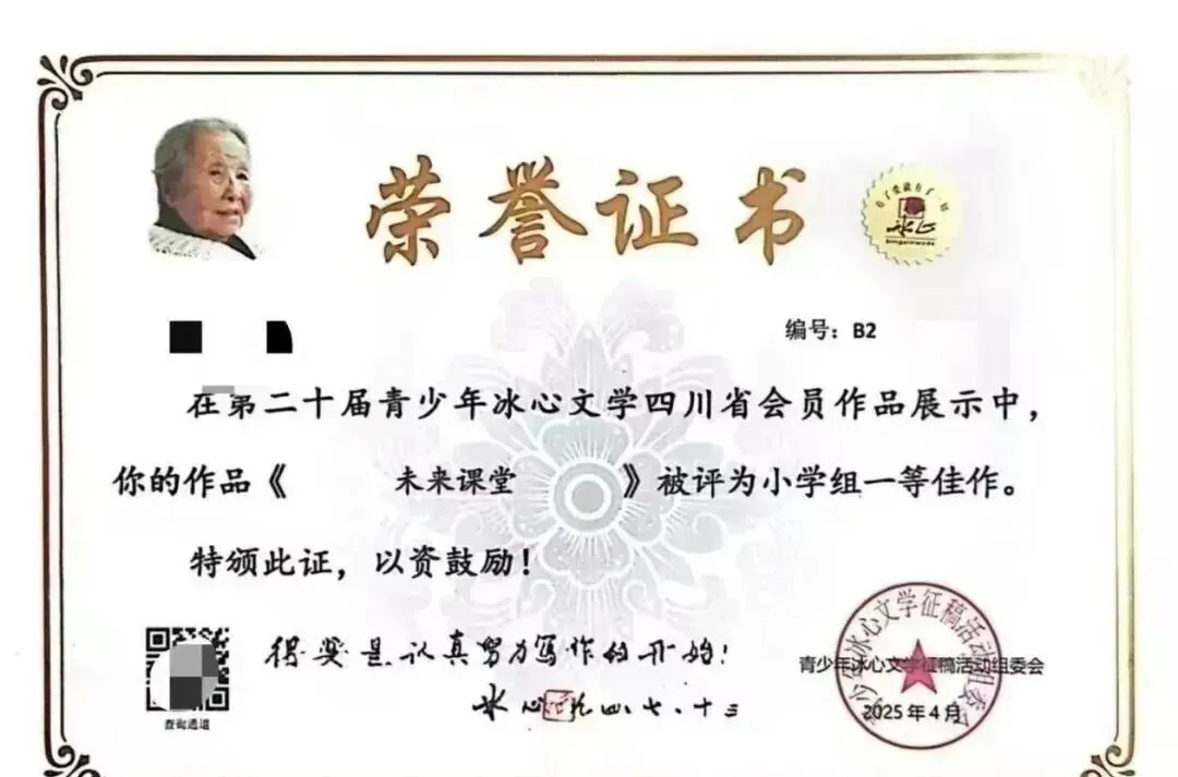 ✅ 成长通道:优秀作品将有机会入选《冰心文学年鉴》正式出版,并推荐参与“冰心文学少年班”,获得知名作家面对面指导,为孩子的文学之路点亮明灯。