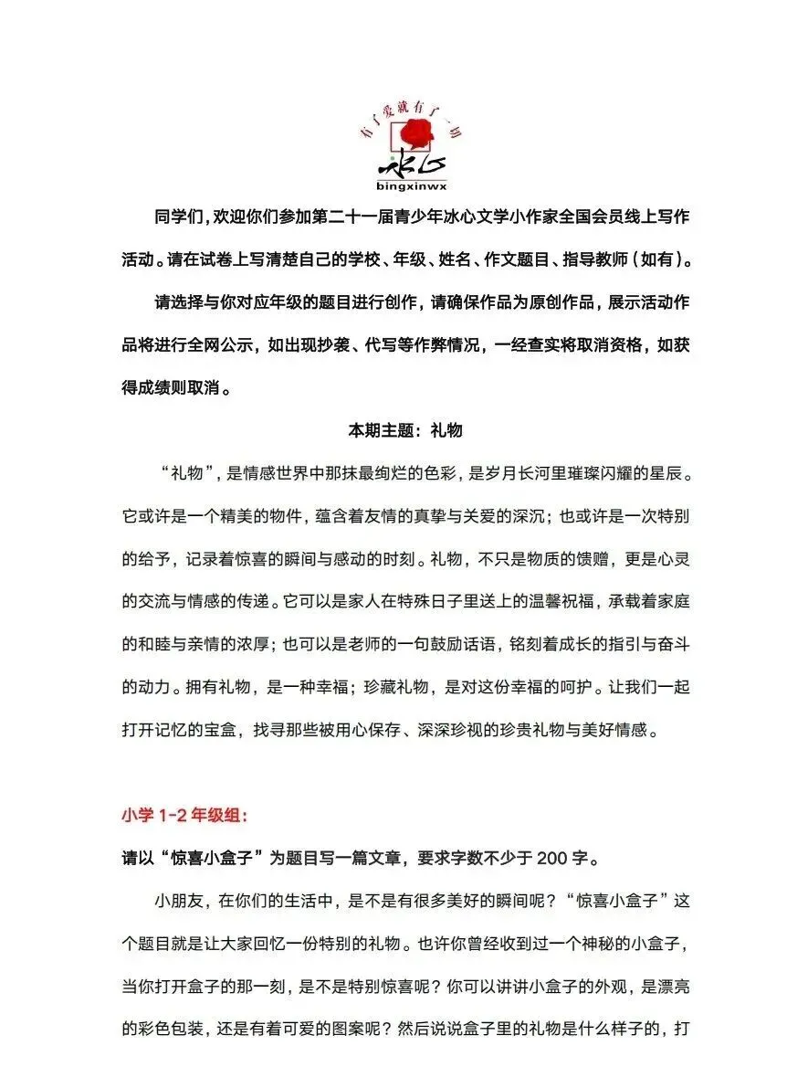 4. 冰心作文写作要求及提交方式:随题目发放