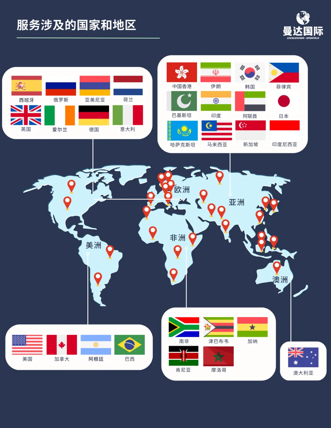 目前已经开通中国香港、美国、英国、加拿大、BVI/开曼等英属离岸群岛、澳大利亚、爱尔兰、南非、韩国、菲律宾、意大利、西班牙、德国、新加坡、马来西亚、巴基斯坦、俄罗斯、印度、哈萨克斯坦、阿联酋、伊朗、亚美尼亚、摩洛哥、加纳、津巴布韦、阿根廷、巴西、荷兰、日本、泰国、肯尼亚、印度尼西亚等30多个国家的海外公证,海牙认证,领事认证及无犯罪代办等服务。
