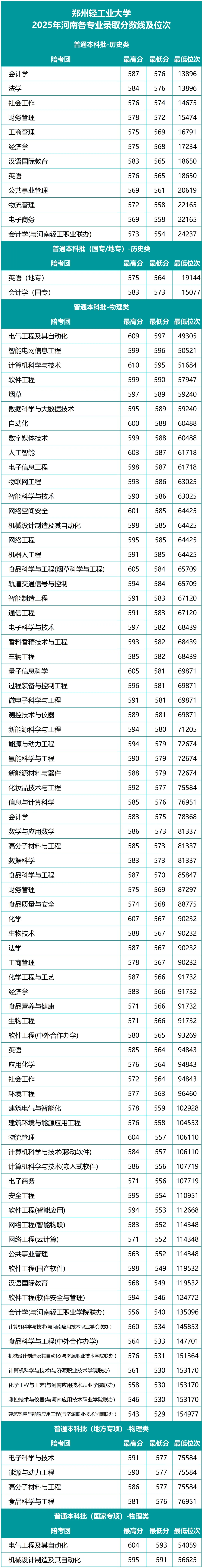 郑州轻工业大学2025年河南各专业录取分数线及位次