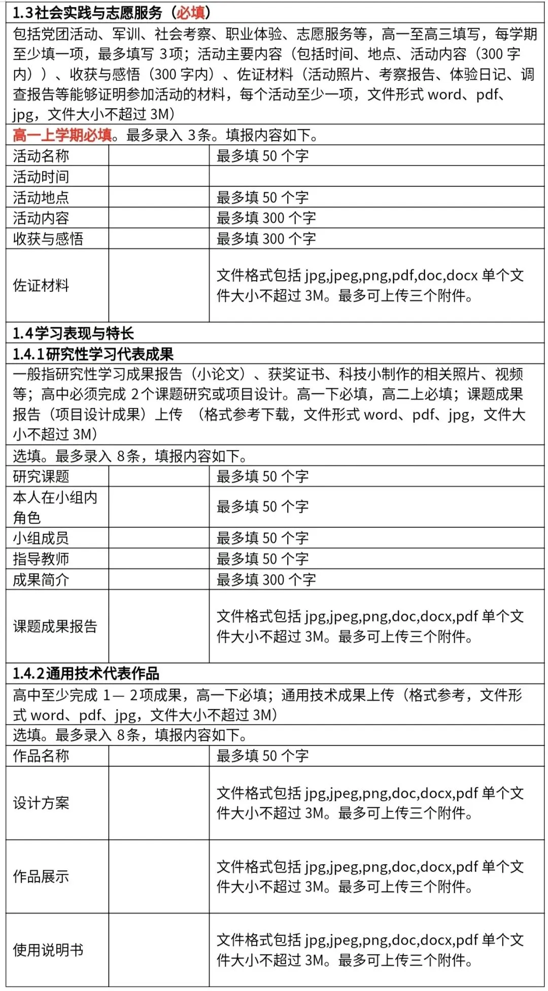 平台每个部分,都要按照要求上传填写内容。综合素质评价档案中大部分内容为选填项,但有些内容却是必填项,包括社会实践与志愿服务、研究性学习、通用技术和期末小结。那么,如何提前准备相应内容呢?