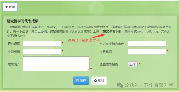 一般指研究性学习成果报告(小论文)、获奖证书、科技小制作的相关图片,视频等;高中必须完成2个课题研究或项目设计。高一下必填,高二上必填;课题成果报告(项目设计成果)上传(格式参考下载,文件形式word、pdf、jpg文件大小不超过3M)。