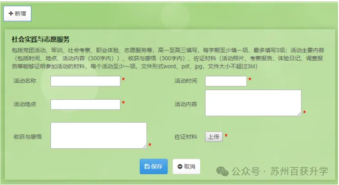 2、活动主要内容(包括时间、地点、活动内容(300字内))、收获与感悟(300字内)、佐证材料(活动照片、考察报告、体验日记、调查报告等能够证明参加活动的材料,每个活动至少一项,文件形式word、pdf、jpg,文件大小不超过3M)。