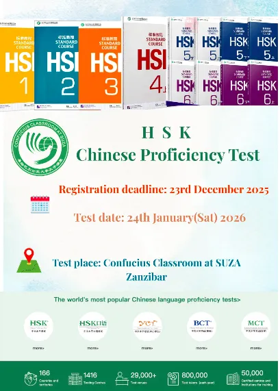 1月24日,桑给巴尔公立大学孔子课堂顺利举办2026年度首次汉语水平考试(HSK)。本次考试开设HSK一级至五级,共有33名考生报名参加,考试组织规范有序、考场运行平稳顺利。