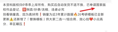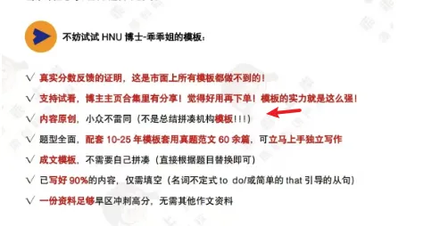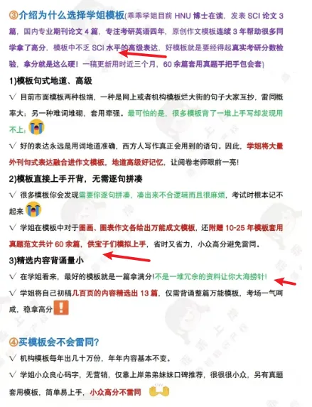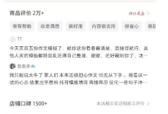 模板更像是一种sop的交付形式,一次制作完成后,大家买了后直接去套用,都能修改也都能用。这也给我们一个做品的启发,标准化的交付流程,也就是为什么很多博主也会录制课程,这个课程是提前录制好了,一份儿标准化的课程,同学来了就可以直接学习,价格也比较适中。我们可以发现,这个品,两个店铺都卖出了上万份儿,单价接近30元。虚拟品,30元的单价不算低,这个价格品,大多数需要自己花一定的时间去做才行。类似的,我们看看相似的品,通过网络上整理而来的是什么情况?既然叫做模板,很可能同地区的很多学生都用到了相似的模板,博主考虑到了同学们的疑点,所以还专门的强调了这点,稳定购买者的心态,解决他们的顾虑同时为了防止过度的倒卖,在商品详情的开篇就给大家强调了懂法的重要性:资料已经申请版权,不要去乱整。直接阐明产品的差异性和优势。大家可以和蓝蓝一起来学习这个产品的介绍,告诉用户为什么要选择这个模板。(3)、容易上手,拿来直接用,背诵量小:不会占用过多时间,省事儿博主从用户的时间、质量等多个角度出发,让用户安心下单和备考。最后留下满屏的好评图,再给用户一个强心剂,下单也就成为了理所当然。往下看的时候,发现好评有2w+,这也一定是博主的心思所在。常见的手法在之前的分享中提过。用户购买了,通过好评的方式赠送额外的服务,这个服务在用户看来其实是需要付费的,通过评论能获取。当然了,长远的考虑源于用户发自内心的saysay~~除了通用的作文模板,博主还有199的定制化修改和答疑。每个学生的基础不一样,对于基础稍微差一些的,需要带练和针对性修改,199的价格,也卖出了700多份。不过199的品有答疑和修改的次数限制,根据次数的不一样,还有399和499的品。用心的去打磨一个小品,在做的过程中,会逐渐的开启一些新的思路,如果是新人,更应该静下心的思考做什么品,相对市面上的品提供哪些差异化,是当前浮躁社会下,需要我们认真去思考的点。这个账号粉丝1.5w,发了137篇笔记,接近两年的时间,模板买了几万份,看看它的图文笔记。蓝蓝看了博主的部分笔记,发现一个非常有意思的点,博主的绝大部分笔记除了封面,内页均是用户的反馈信息,无论是小红书私信还是微信的聊天。恰恰用户的反馈才是更有说服力的,吹的再厉害,不如用户的的真实体验。提醒我们后面做自己产品的时候,要记得积累自己的反馈案例库。你好,我是蓝蓝,校招获得了多家大厂的offer,最后选择了国企。读研期间通过公众号、虚拟资料副业等副业项目变现100w,期待更多的小伙伴和蓝蓝一起来打造我们自己的第二曲线。这是蓝蓝的26年度社群,最近在招募中,前100名内测价49.9,需要的宝子文末联系蓝蓝即可。一起加油呀!