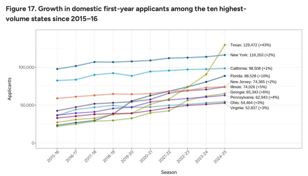 过去几个申请季,佛州学子正被全面推上全国名校竞争的主赛道。Common App数据显示,在2024–25申请季,来自佛州的申请人数同比增长约10%,不仅高于全国平均水平,也已经使得佛州跃升为全美申请人数第四多的州 (仅次于德州、纽约和加州)!