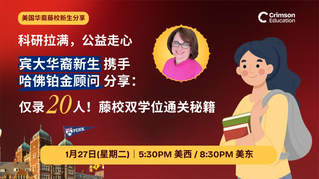 1月27日(周二晚)Crimson本申请季首场华裔生分享!【本季宾大录取华裔新生】携手【哈佛前面试官+Crimson铂金级名校顾问】:她是如何在高度同质化的申请环境中,找到真正适合自己的「硬核科研+高影响力公益赛道」?从兴趣萌芽、方向确立,到长线布局 — 她又是如何让个人成长与项目理念高度契合,最终闯入这个每年仅录取20人、对使命感与跨学科视野要求极高的顶尖藤校项目?