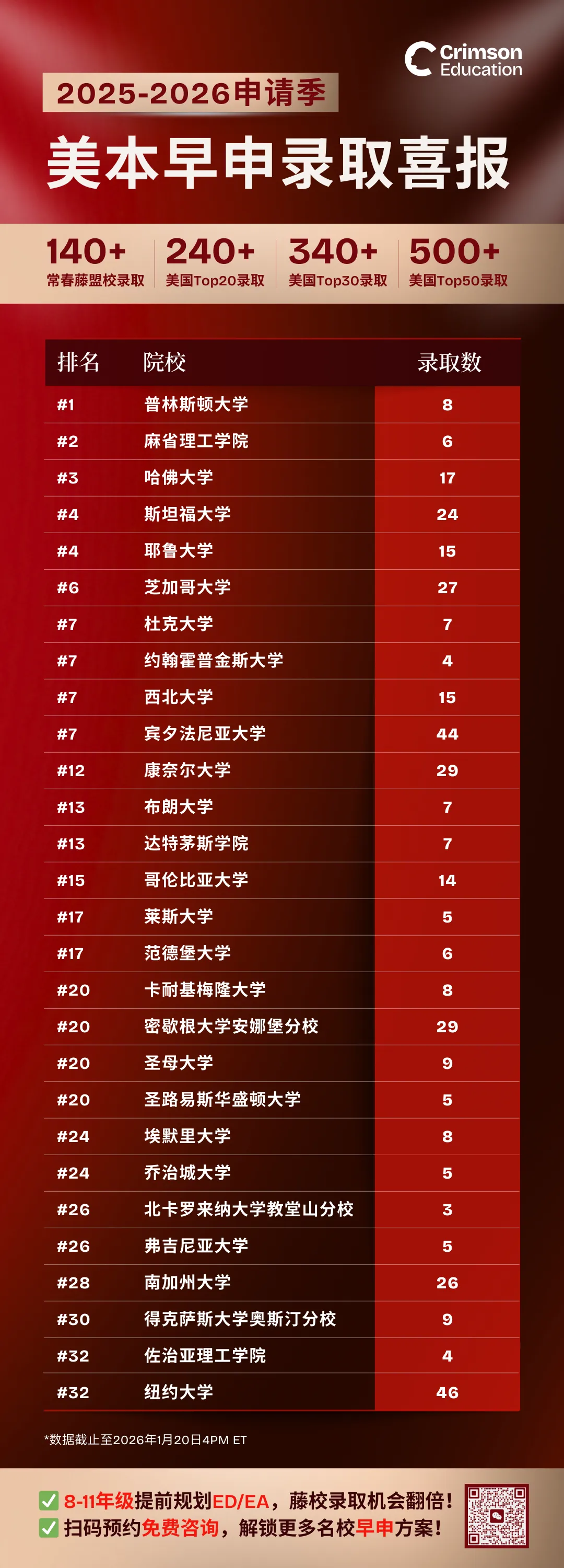 25–26早申战报出炉!美本顶尖名校录取纪录,再次被Crimson刷新!本轮早申Crimson学生共斩获223枚美国Top 15名校录取,其中哈佛17枚、斯坦福24枚、MIT 6枚、耶鲁15枚、普林斯顿8枚、宾大44枚、芝加哥大学27枚...