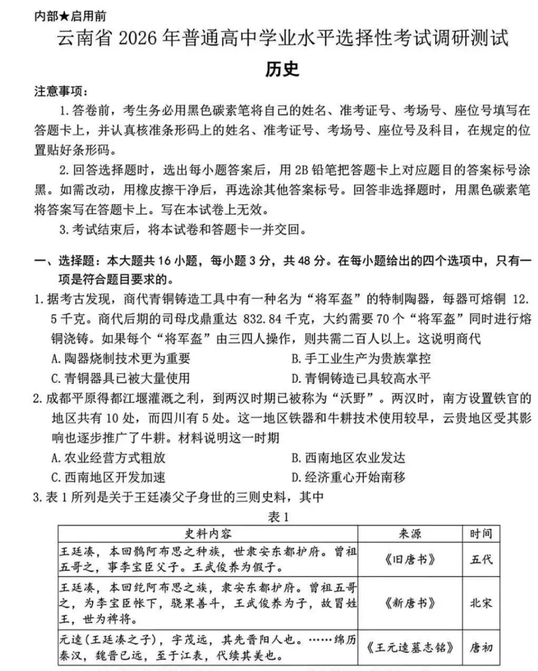 1、云南省统测云南省2026年普通高中学业水平选择性考试调研测试-历史