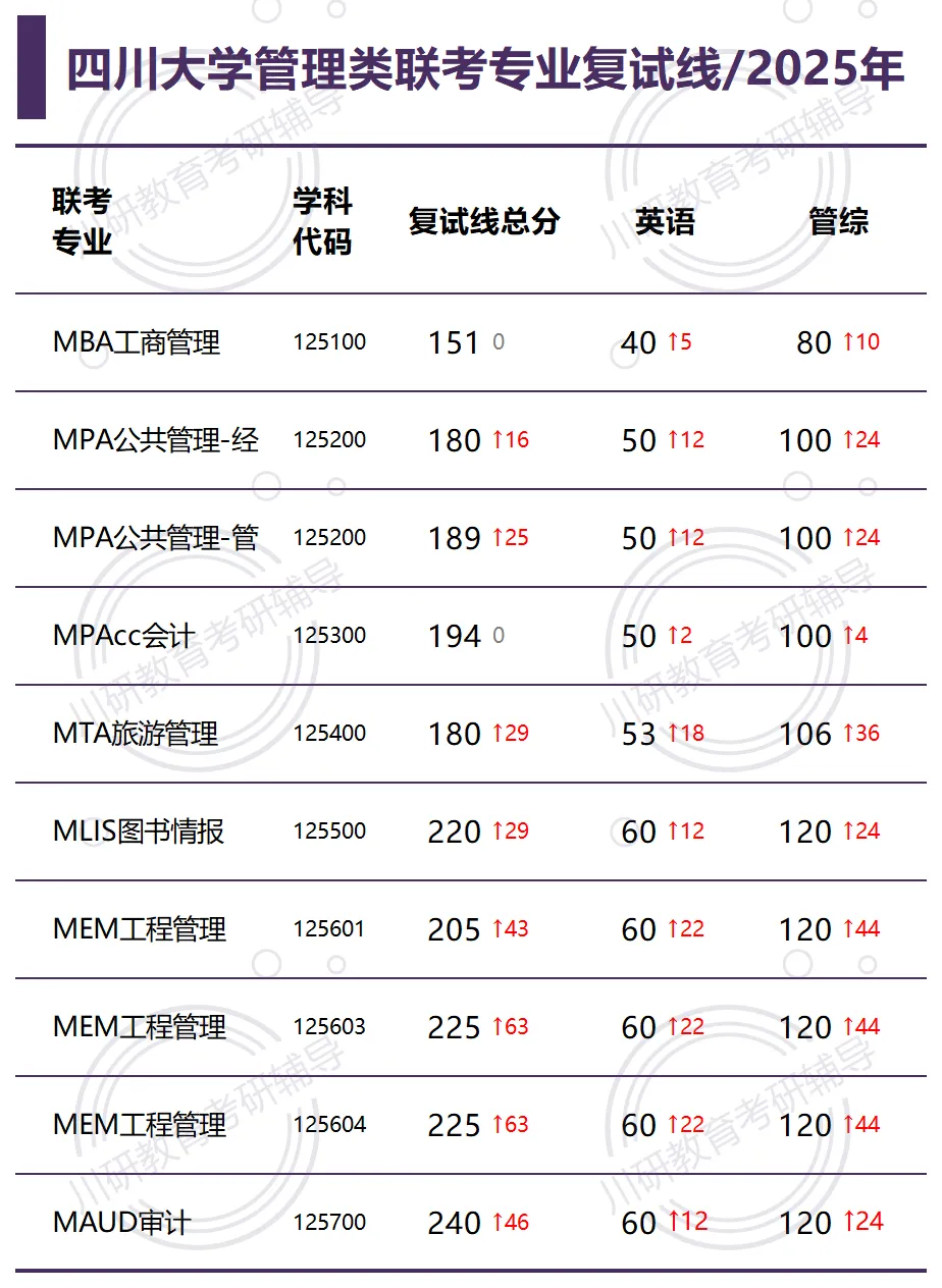 四川大学2025年管理类联考7大专业,除MBA工商管理、MPAcc会计外,复试总分均高于国家线,特别是MEM工程管理03和04方向,总分高国家线63分,英语22分,管综44分;而MAUD专业则是上岸难度最高的专业。