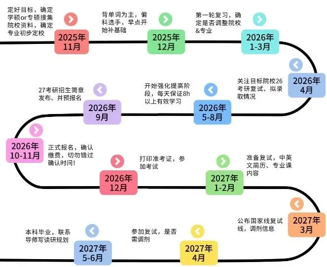 明确了“考什么”这个大框架,接下来我们就可以清晰地规划“何时做”了。考研是场长跑,记错关键时间点可能真的会“再来一年”!下面这份为27考研er量身打造的时间攻略图,请你务必收好。