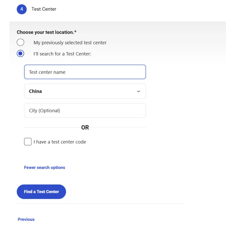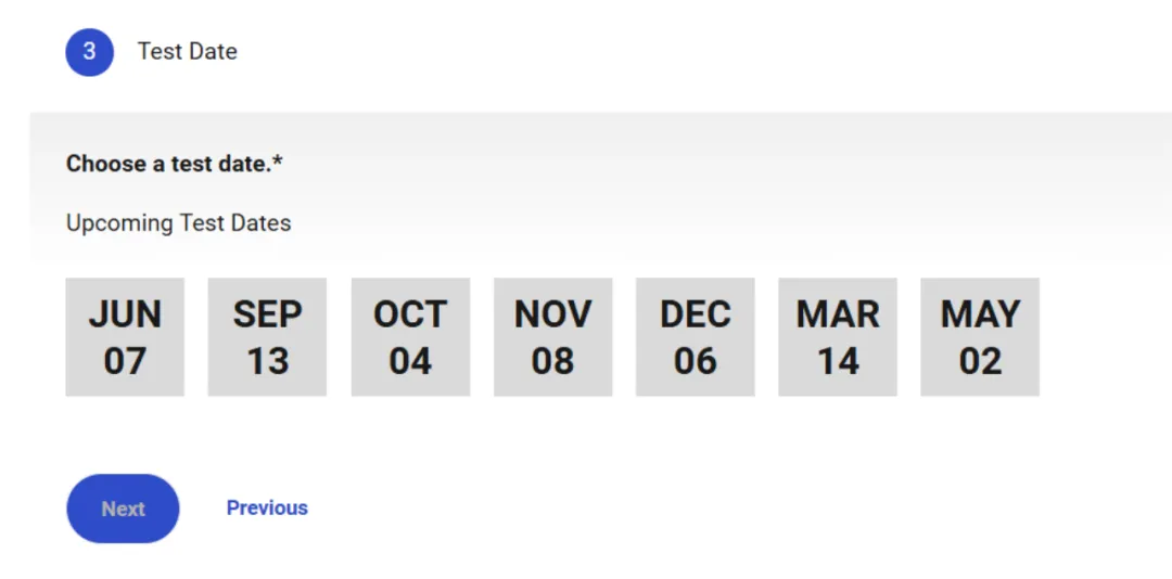 ④ 来到选择考场页面,首先是选择考场所在的国家和地区,点击“Next”继续。系统会跳过2,直接来到3,选择考试日期。