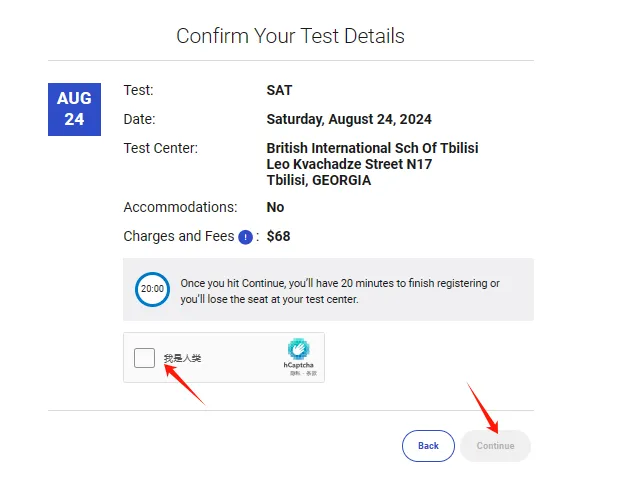 ⑤ 确认考试信息正确后,点击“Continue”按钮,接下来需要在20分钟内完成信息上传并付款,否则考试名额会被释放。