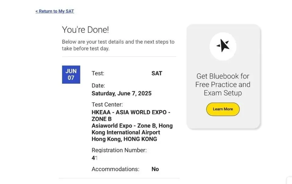⑥ 最后,上传照片,报名完成、进行付款,交费成功后,在页面中可以看到“You’re Done”,说明考试已经报名成功。