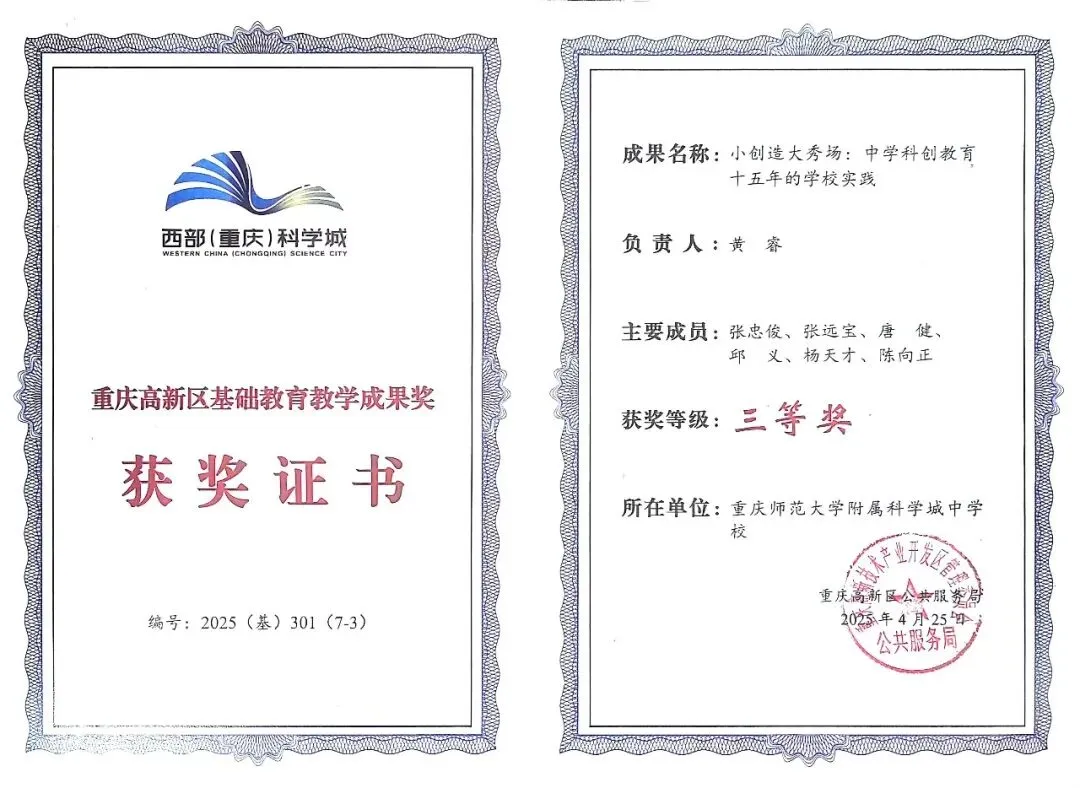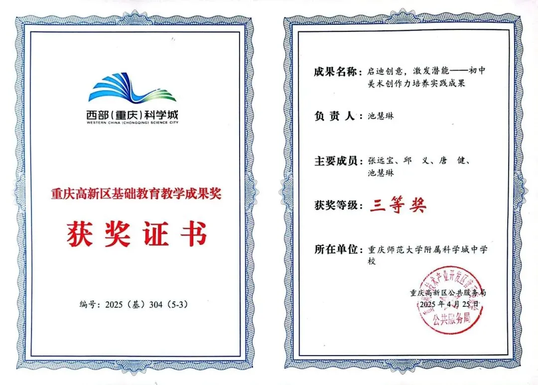 1项教学成果获高新区基础教育教学成果一等奖,另有3项教学成果获高新区基础教育教学成果三等奖。