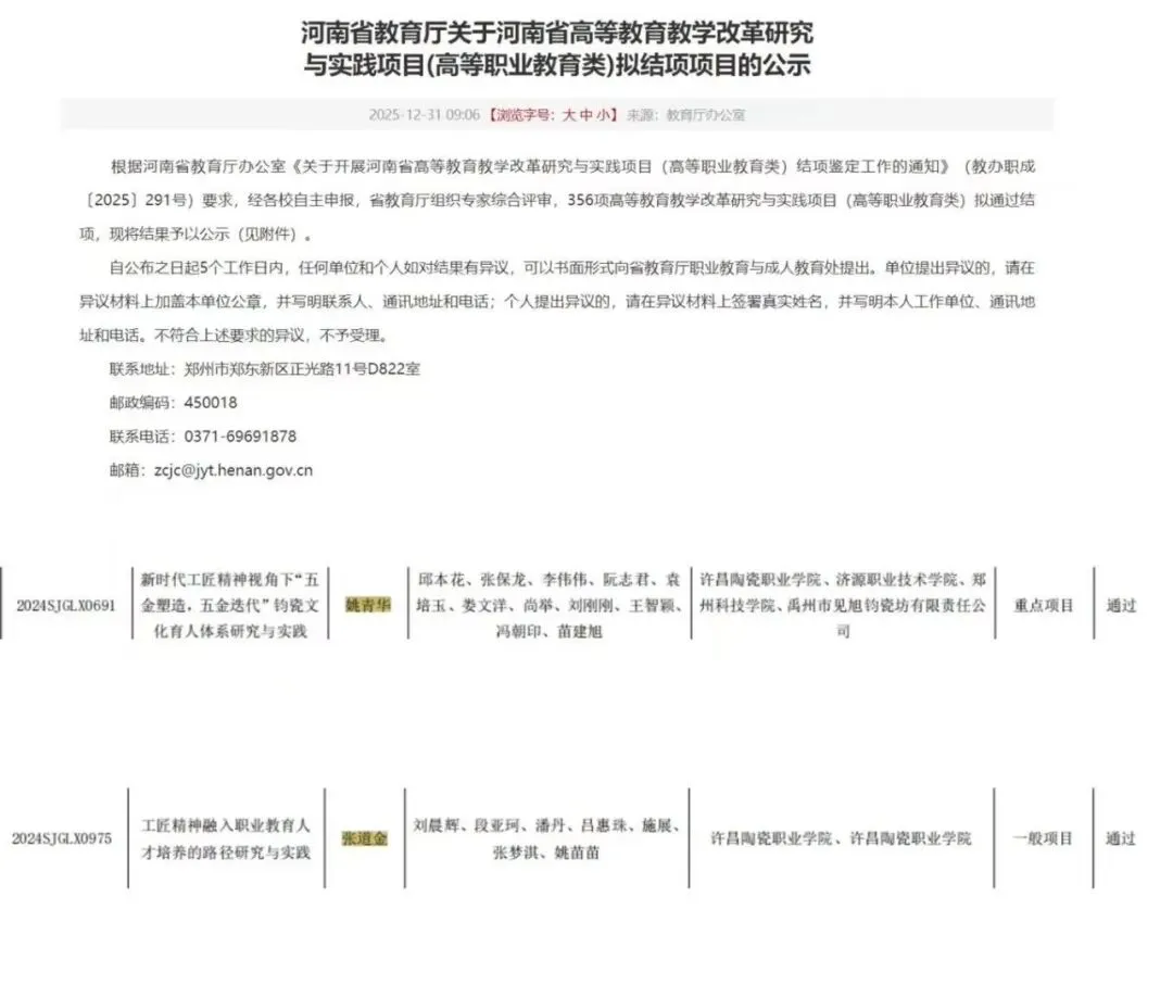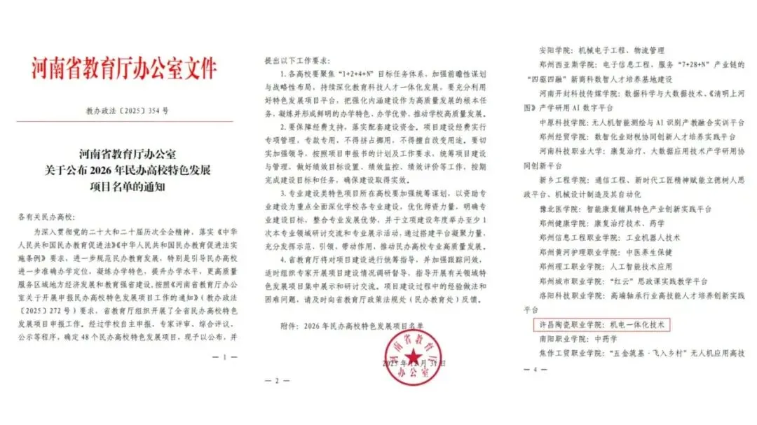总结经验,凝练特色。学校教务处、相关二级学院在推进2025年河南省民办高校特色发展项目—陶瓷设计与工艺专业特色类项目中期检查工作的基础上,积极申报2026年河南省民办高校特色发展项目2项,其中,机电一体化技术专业成功获批2026年河南省民办高校特色发展项目(专业特色类)立项建设。