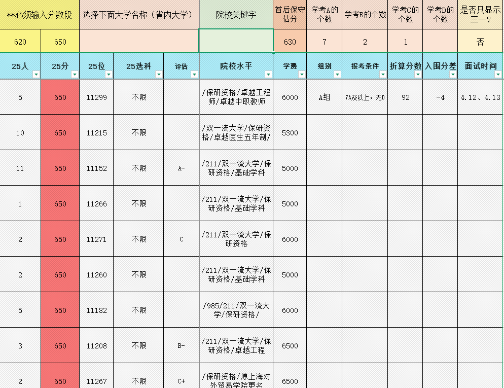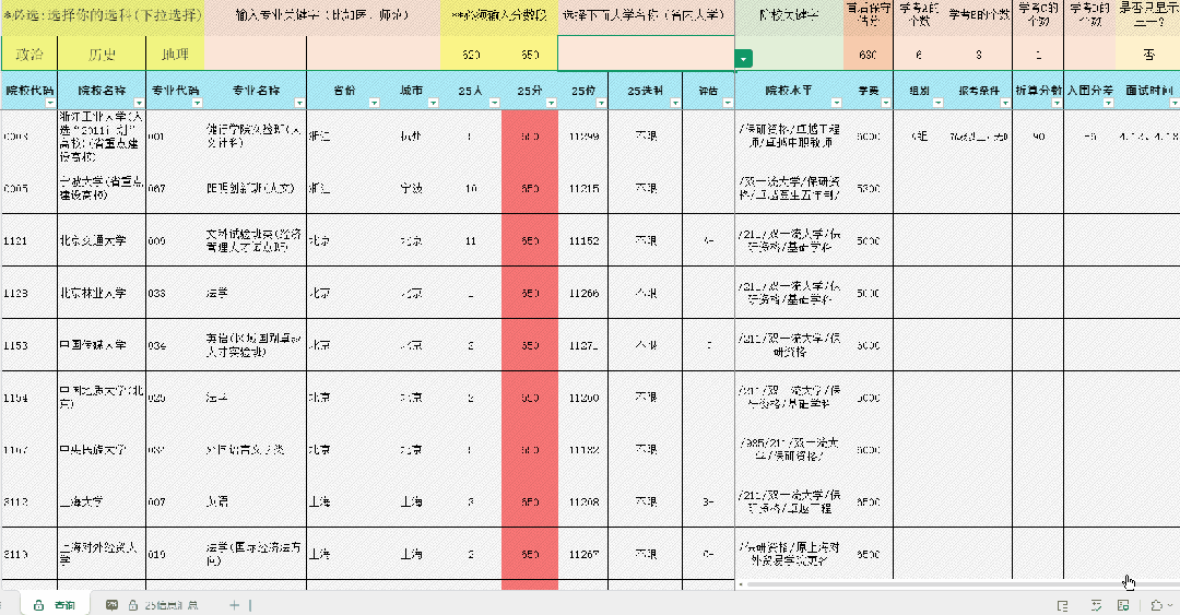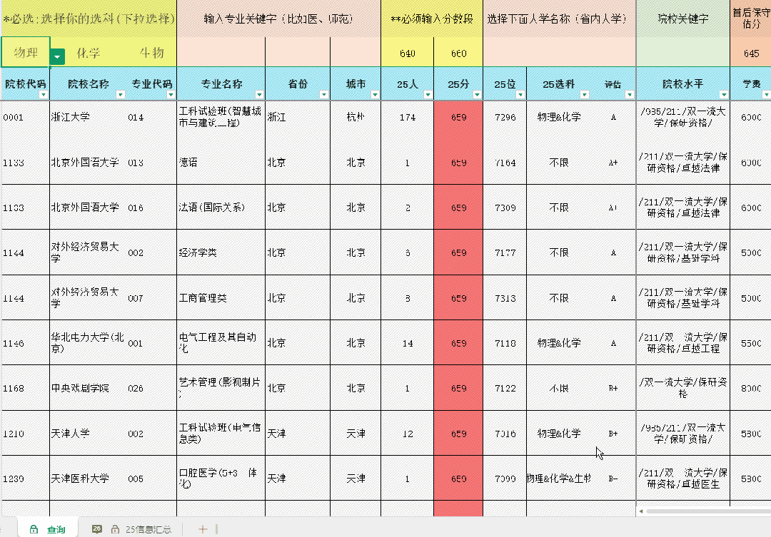 【扫二维码-->申请权限,通过后方可查询(共享版),进入以下这个界面 说明:25分指25年平行志愿录取分,不用颜色表达与保守估分比较,红色表示差距很大,绿色表示稳,紫色表示保。】第1步:选择选科,输入分数段和保守估分(必选项,必须输入)