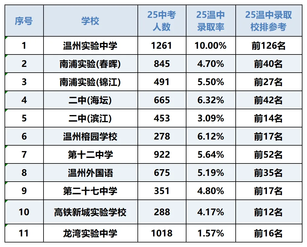 鹿城片区(市局直属 + 鹿城区属初中):想走统招进温中,区排需稳定在前 3% 内;校排则看初中梯队,实验中学、南浦实验等第一梯队初中,校排前 5% 是稳妥线,第二、三梯队初中需冲校排前 2% 才有竞争力。