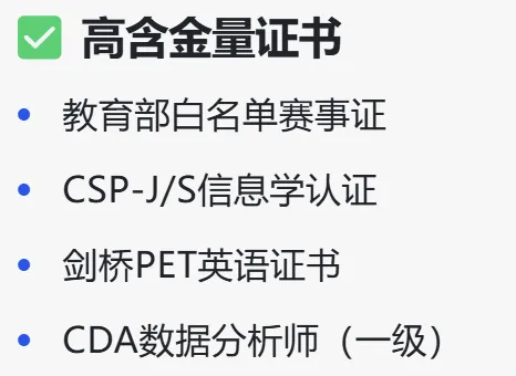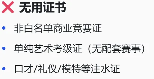 以下证书无论花多少精力,2026升学都无实质帮助,早放弃早解脱。- 非白名单商业竞赛证:机构包装的“国际金奖”“全国大赛”,学校一律不认,本质是花钱买证的智商税,升学简历通过率0%;