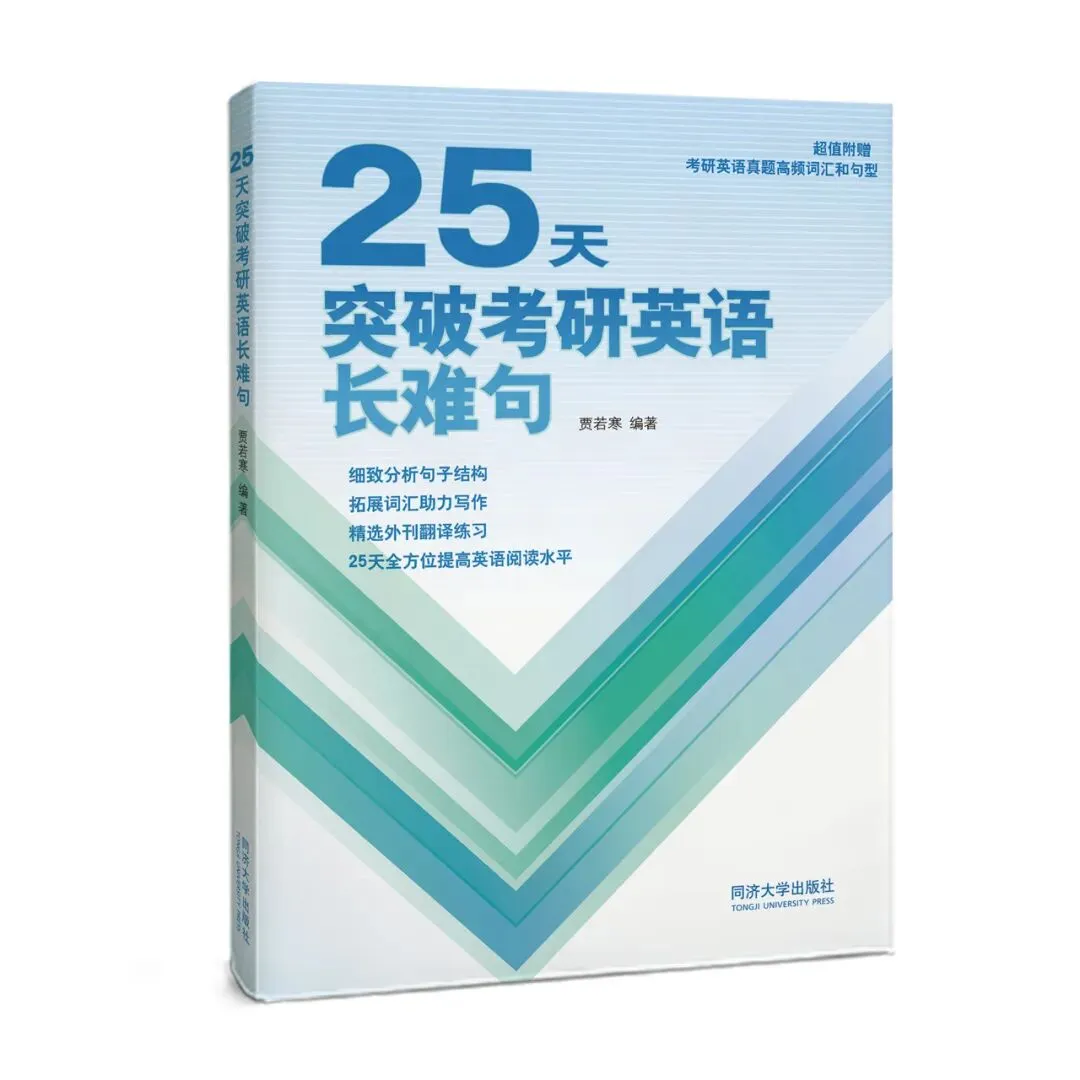 以上内容选自《25天突破考研英语长难句》随书二维码附赠的电子版《考研英语历年真题分类话题句型》,贾若寒编著,同济大学出版社出版。各大电商平台有售。考研英语备考(大学英语四六级和高考英语用户以及雅思托福SAT用户也适用),购买《25天突破考研英语长难句》。扫描封底二维码免费获得附赠的考研英语历年真题分类话题词汇和句型,方便考生按照话题背单词、记短语、学句型,帮助各位考生进一步提升词汇量和理解能力。书中还有英译中训练,帮助各位考生加强语言应用。各位同学拿到书后翻阅前言和使用方法,按照使用方法的说明使用本书。