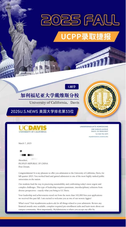 Y同学,来自北京某国际学校,原本成绩中游。在UCPP的体系内,他通过双学分课程夯实了学术基础,并积极参与相关竞赛,最终成功录取加州大学伯克利分校(U.S. News TOP15),主修数据科学与经济学。
