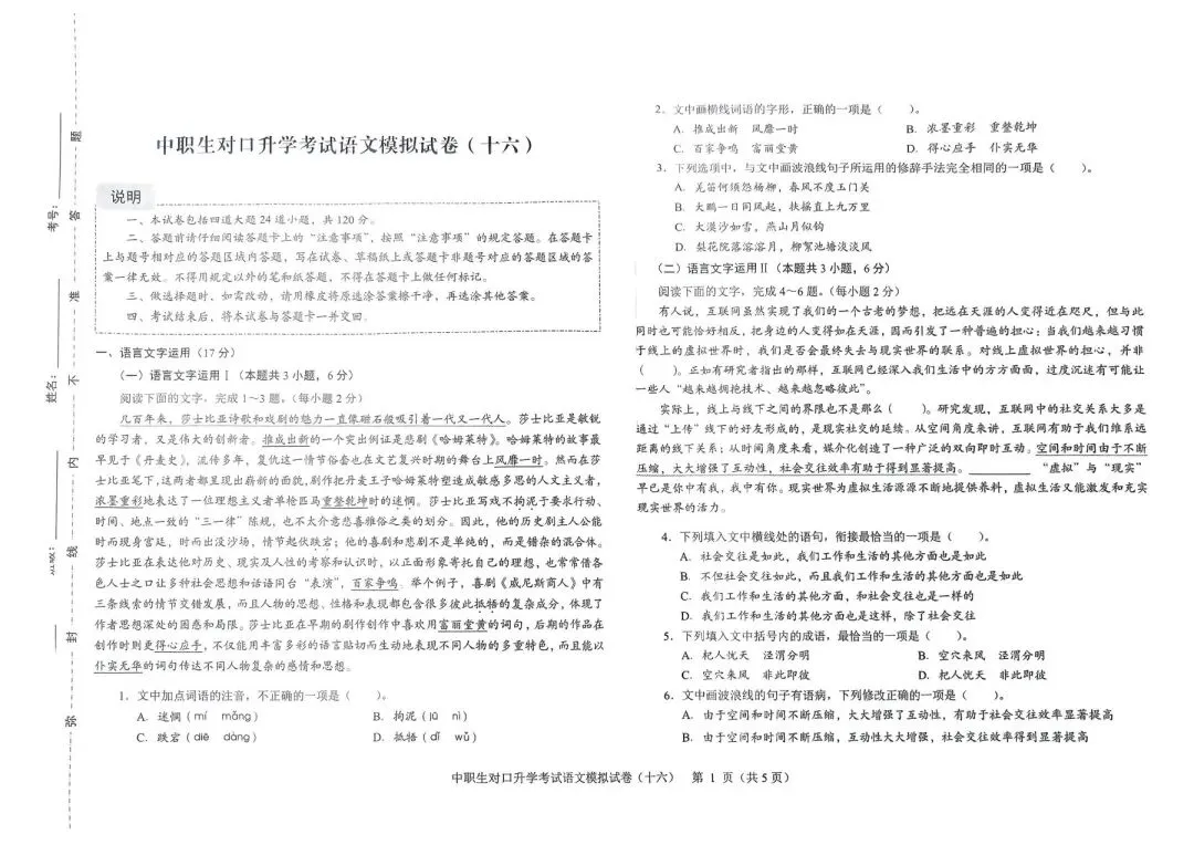 >【语文】河北省中职生对口升学考试——语文模拟试卷(十六)