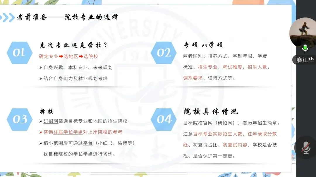 为帮助同学们破解考研与就业的困惑,明确未来发展方向,本次分享会特意邀请到了廖江华学姐和甘学长两位优秀的“过来人”。他们化身暖心“云导师”,褪去青涩、带着沉淀后的经验与思考,隔着网线将自己一路摸索总结的“通关秘籍”毫无保留地分享给大家,用真诚与干货为同学们的前行之路点亮明灯。